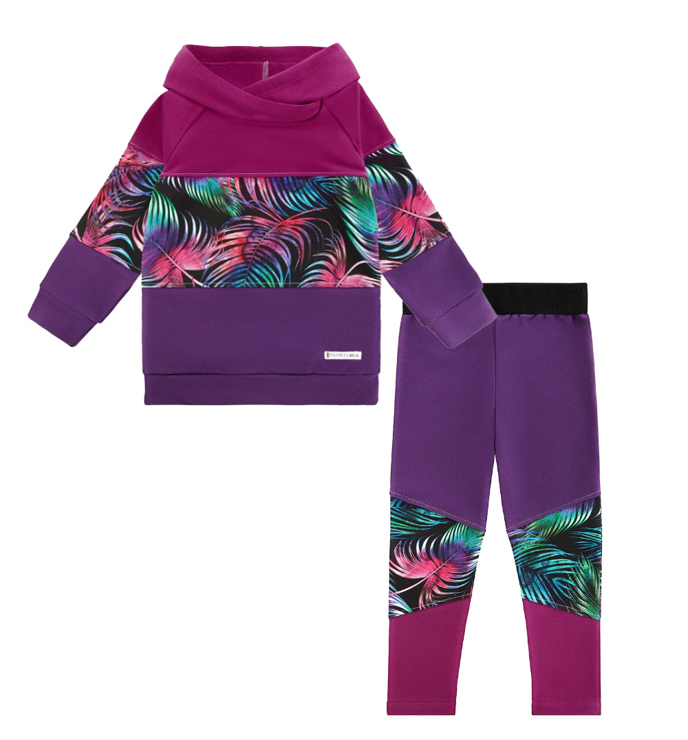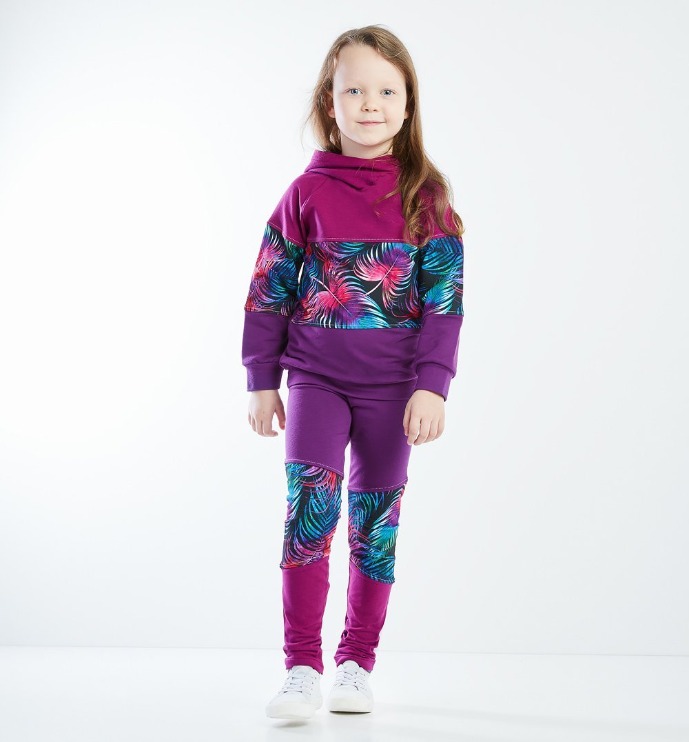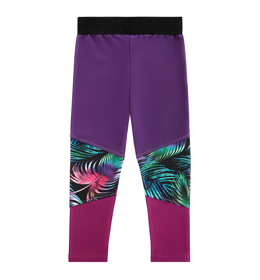 Legginsy mają wykończenia w ciemnych odcieniach fioletu, uzupełnione o motyw w kolorowe piórka.