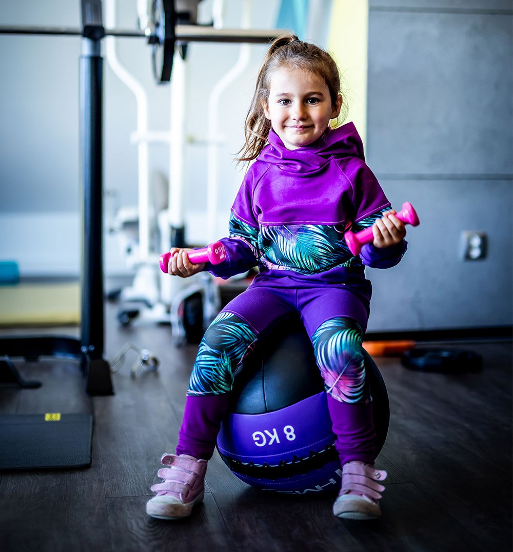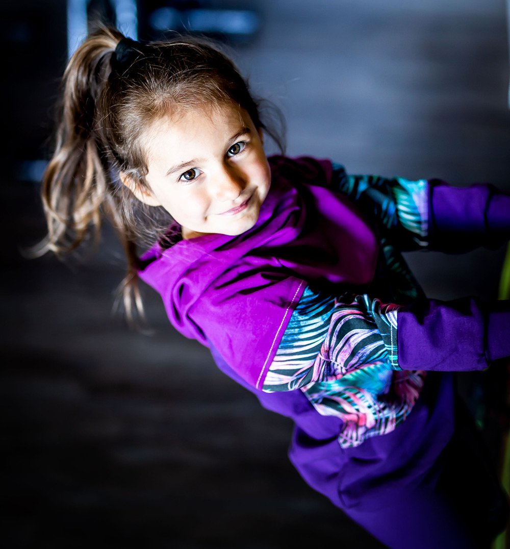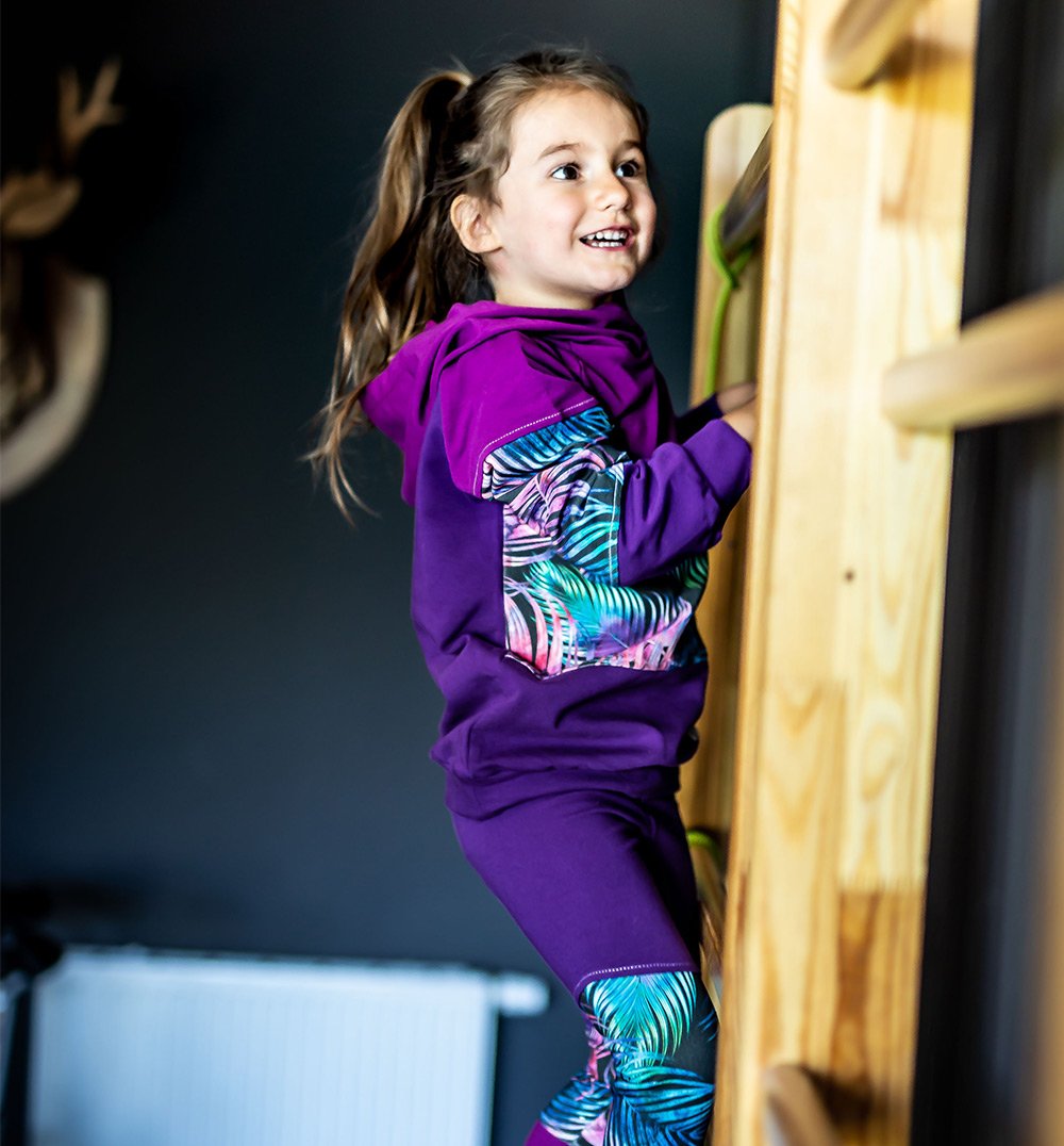 Legginsy mają wykończenia w ciemnych odcieniach fioletu, uzupełnione o motyw w kolorowe piórka.
