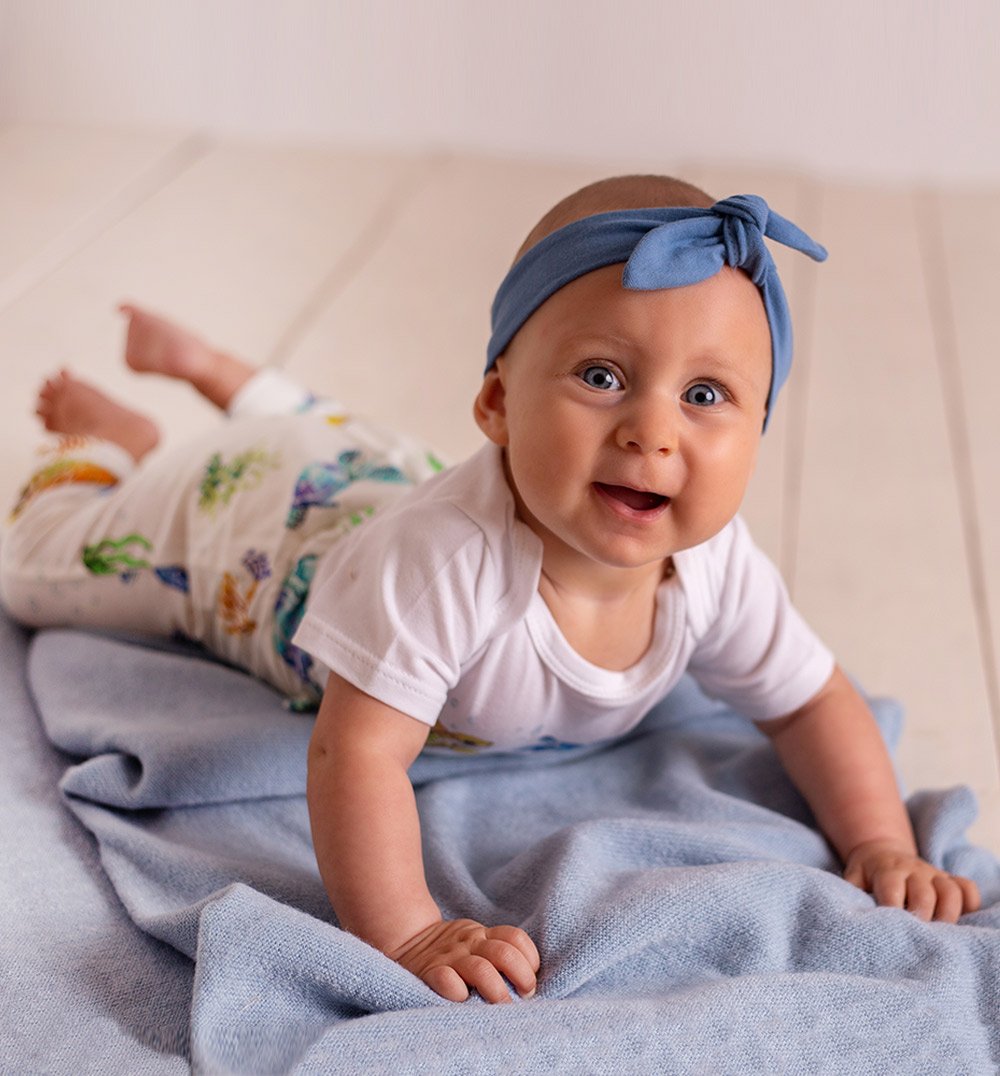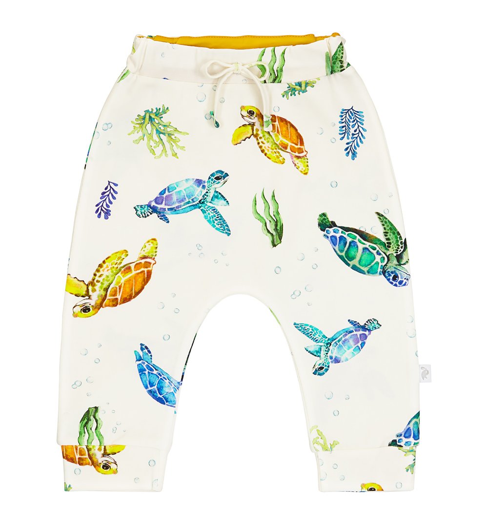 Przewiewne, elastyczne i bardzo wygodne spodnie dresowe z szeroką gumką nieuciskającą brzuszka. W pasie wszyty został dekoracyjny troczek. Spodnie mają delikatnie obniżony krok, co podnosi komfort noszenia oraz dresowe ściągacze na nogawkach. Dzięki nim długość spodni łatwiej dopasować do wzrostu maluszka. Kremowe spodnie w kolorowe żółwie to uniwersalny wybór zarówno dla chłopca, jak i dla dziewczynki. Takie praktyczne dresy warto wybrać kompletując wyprawkę dla niemowlaka.