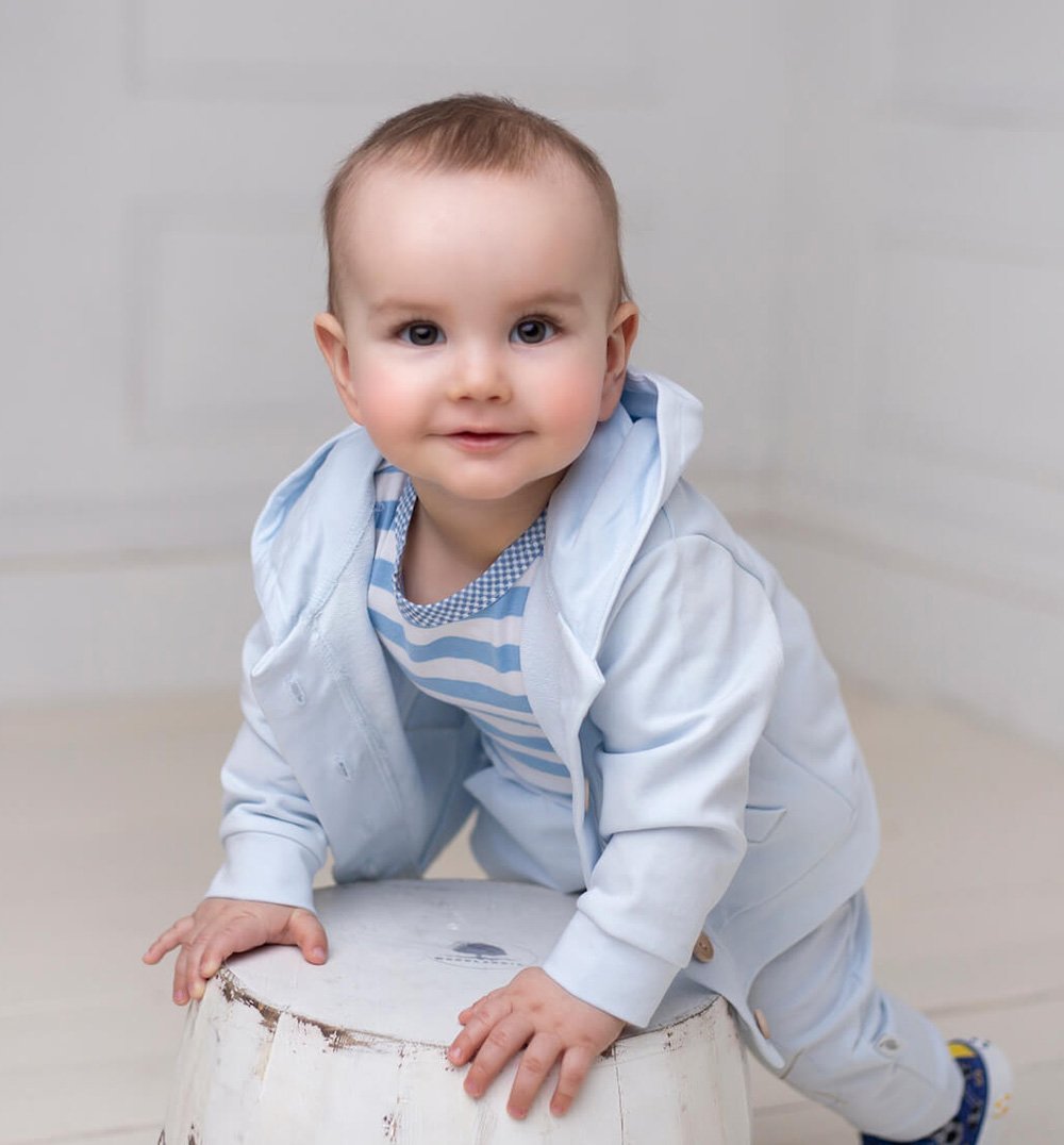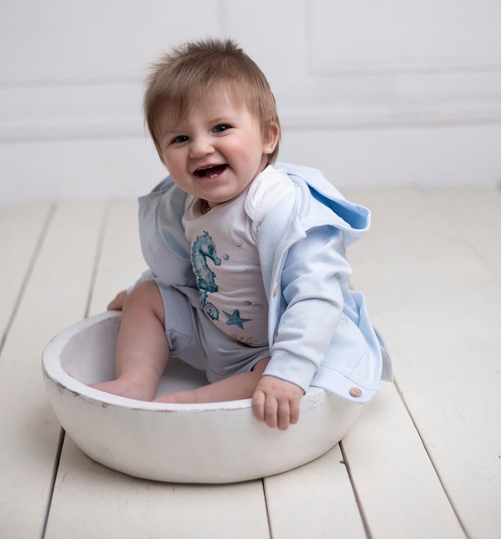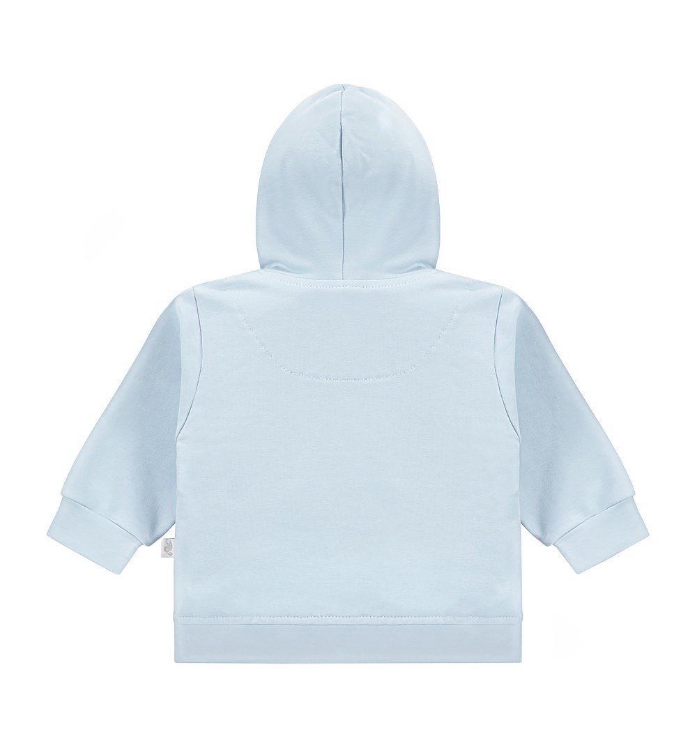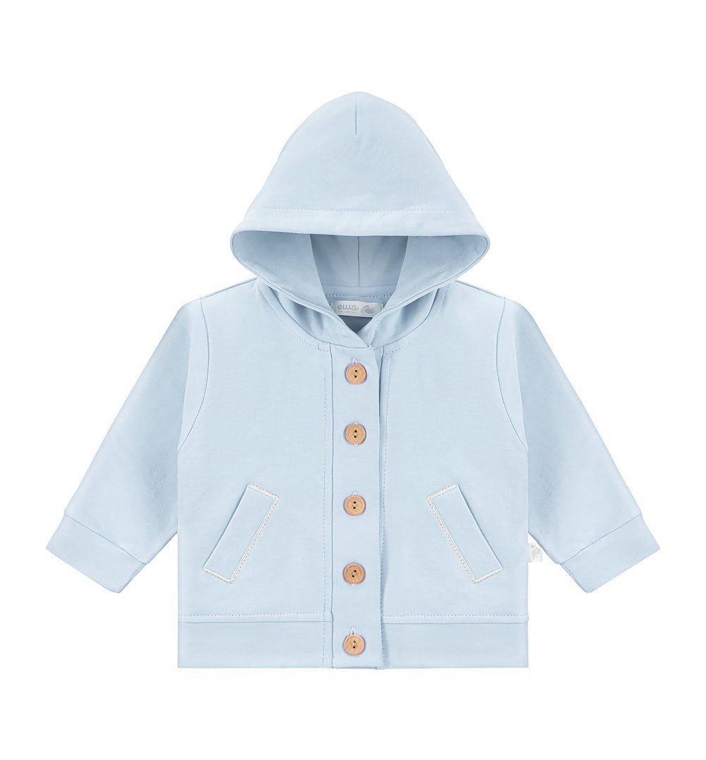 Wygodna i mięciutka bluza dla niemowlaka. Uszyta w Polsce, z wysokiej jakości bawełny, doskonale sprawdza się w codziennym użytkowaniu i zapewnia maluszkowi wysoki komfort termiczny. Bluza ma efektowny kaptur, zapięcie na dekoracyjne, drewniane guziczki i dwie kieszonki z przodu. Delikatny, błękitny odcień doskonale wpisze się w garderobę niemowlęcą. Taka bluza będzie stanowiła wspaniałą bazę do wielu codziennych stylizacji.