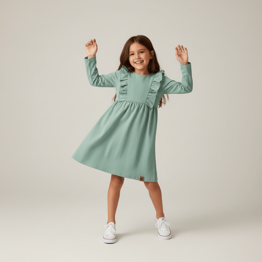 Elegancka sukienka z długim rękawem uszyta w Polsce, z wysokiej jakości bawełny. Jest bardzo efektowna, a przy tym wygodna i elastyczna, co ma duże znaczenie w dziecięcej garderobie. Sukienka jest dopasowana na górze i rozkloszowana od wysokości talii. Górna część została ozdobiona przepięknymi falbankami, które biegną pionowo po bokach. Tył z kolei został ozdobiony efektownymi, drewnianymi guziczkami. Taka stylowa i wygodna sukienka sprawdzi się w wielu sytuacjach. Można wykorzystać ją w świątecznej stylizacji lub po prostu podczas niedzielnego obiadu z rodziną.