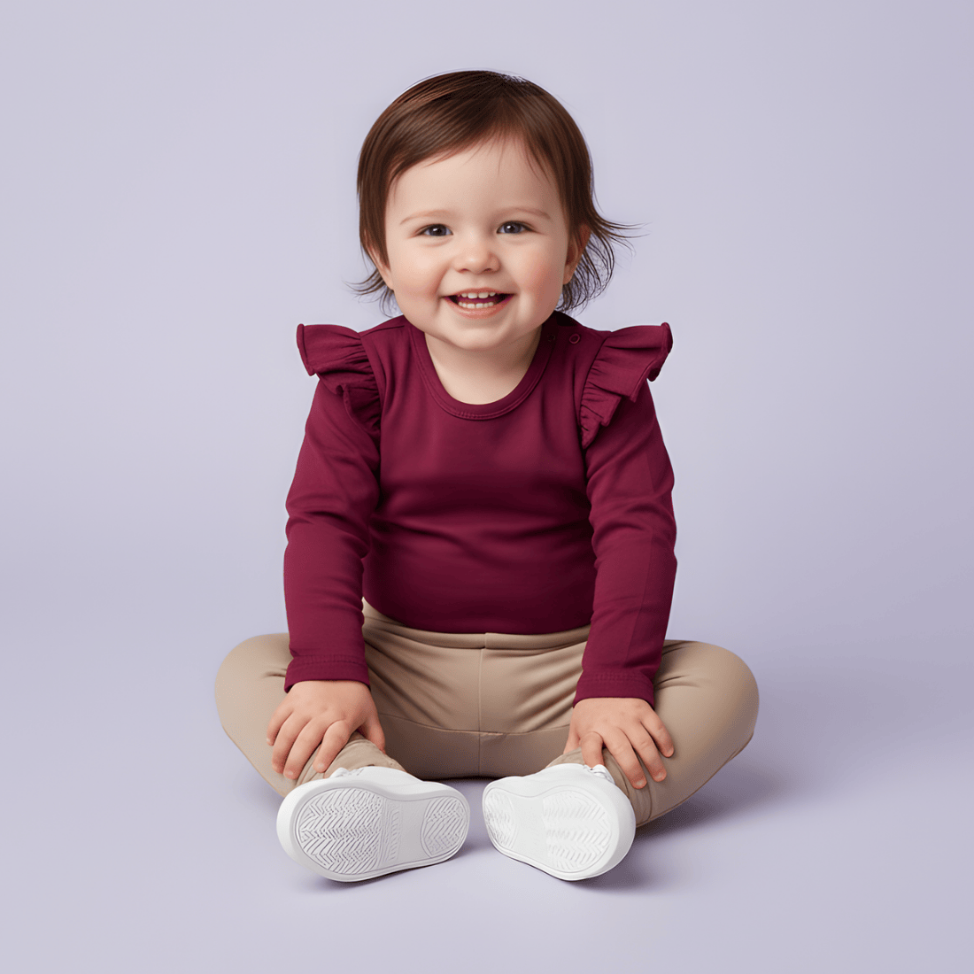 Jednokolorowe body z długim rękawem. Uszyte w Polsce, z najwyższej jakości bawełny. Są bardzo miękkie, elastyczne i wygodne, doskonale dopasowują się do sylwetki maluszka, nie uwierają i nie krępują ruchów. Body mają wygodne zapięcie na zatrzaski w kroku oraz na ramieniu. Napy są bezniklowe, więc także bezpieczne dla skóry maluszka. Body w pięknym, bordowym kolorze zostały ozdobione delikatnymi falbankami na ramionach, dzięki czemu zyskały bardziej elegancki charakter. Można wykorzystaj je w oficjalnych stylizacjach, w zestawie z tiulową spódniczką.