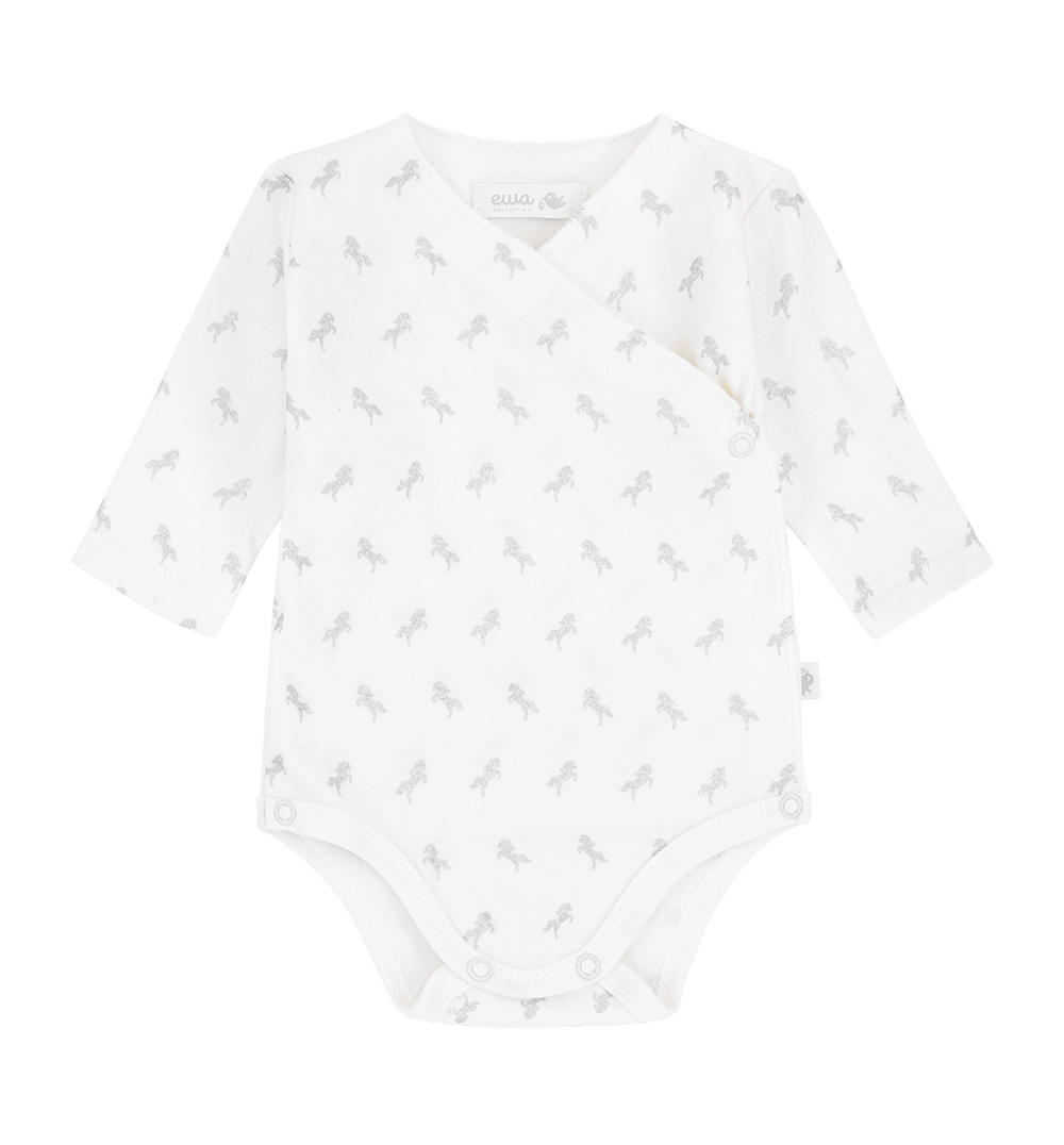 Bawełniane body to jeden z podstawowych elementów garderoby niemowlaka. Body w koniki uszyte zostały z wysokiej jakości bawełny posiadającej certyfikat Oeko-Tex Standard 100 Tekstylia godne zaufania. Jest to gwarancja bezpieczeństwa dla delikatnej skóry dziecka. Body skrojone są tak, by ubieranie było bardzo łatwe, a noszenie ich jak najbardziej komfortowe. Dekolt "na zakładkę" łatwo przechodzi przez główkę. Delikatny motyw w koniki na białym tle jest bardzo uniwersalny.