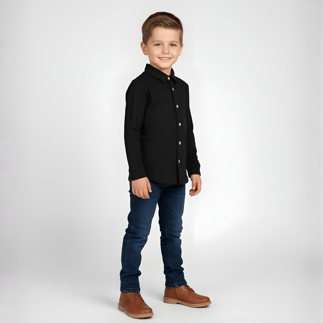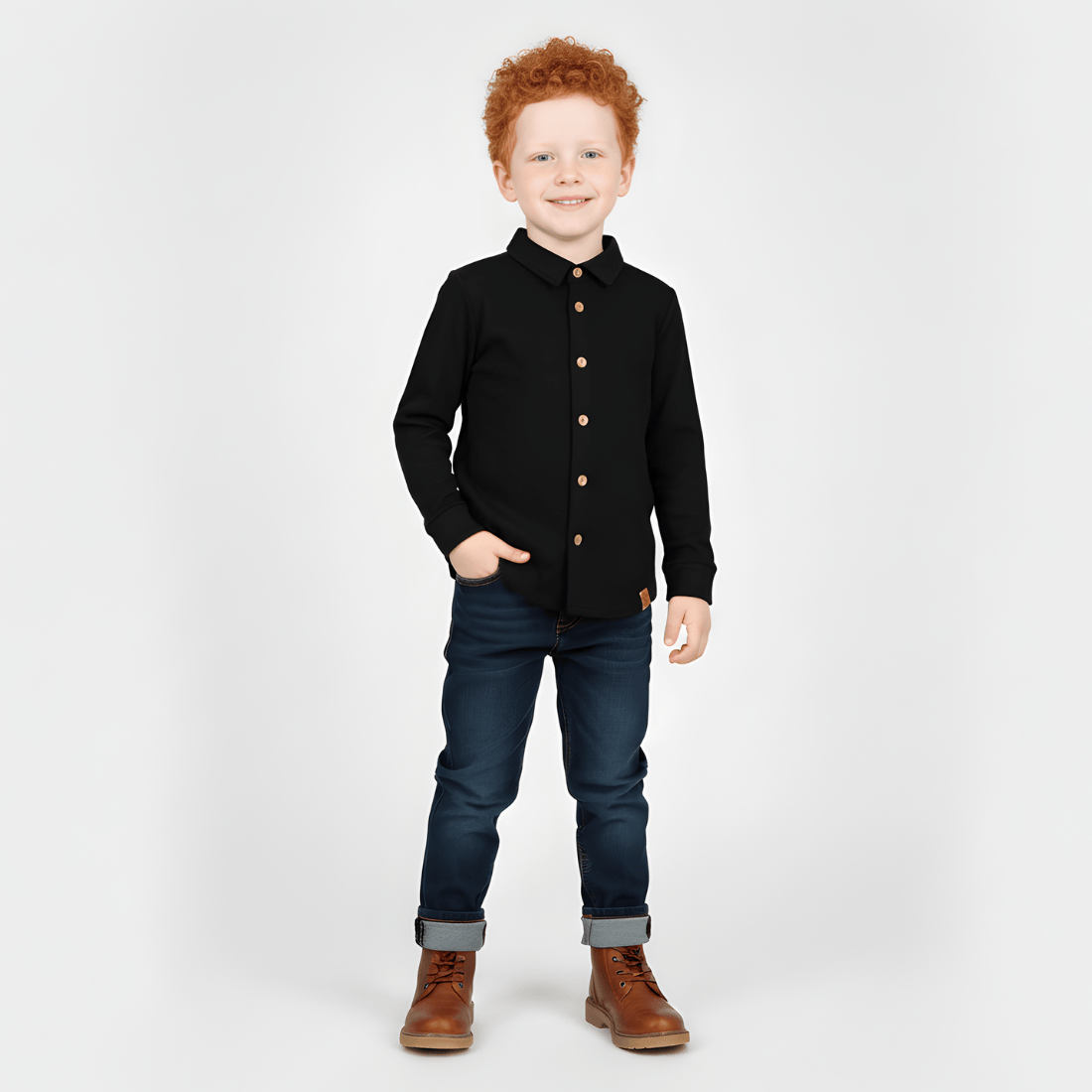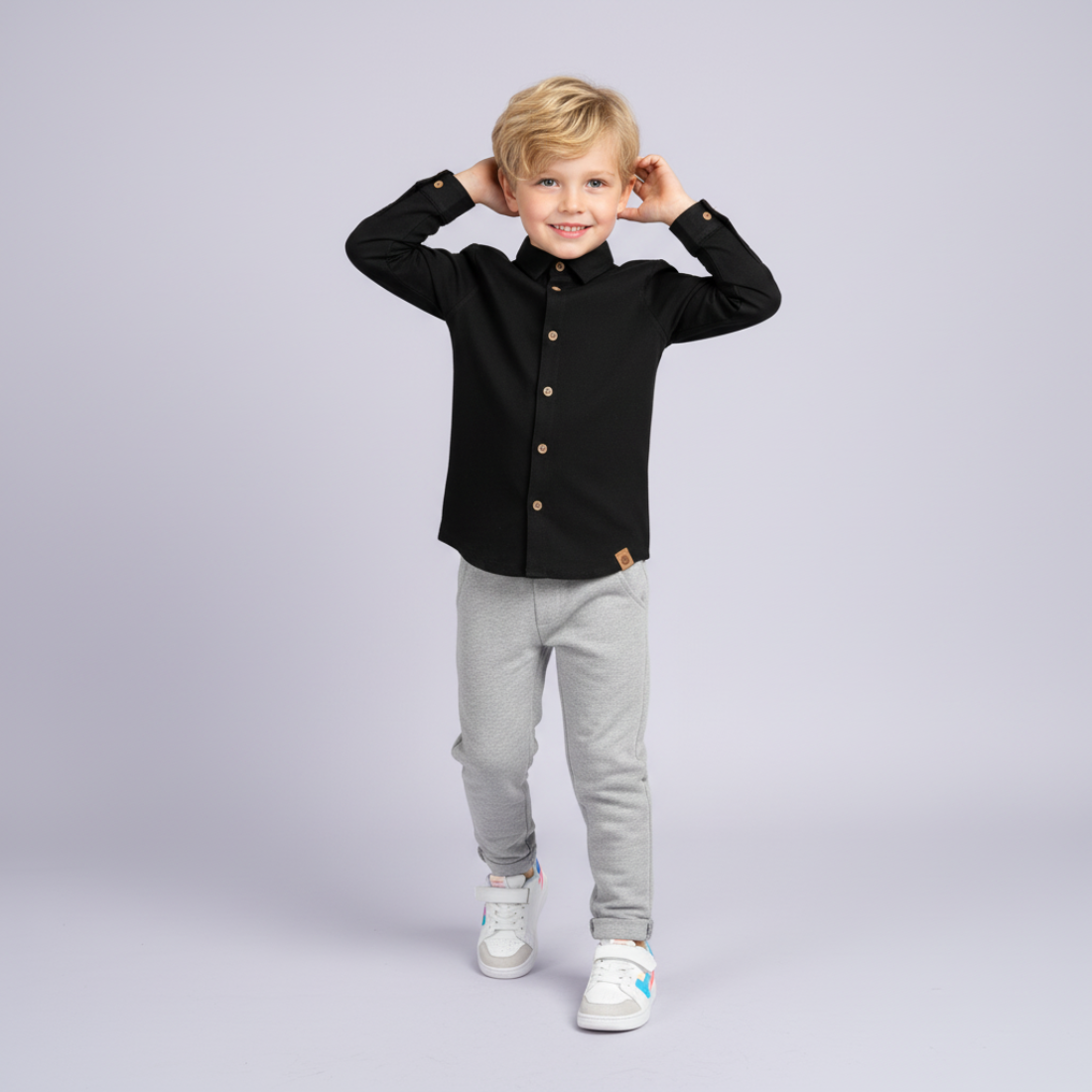 Klasyczna, czarna koszula chłopięca uszyta w Polsce, z wysokiej jakości bawełny typu lacosta. Jest to rodzaj materiału nieco sztywniejszy od tradycyjnej bawełny dresowej, dzięki czemu koszula zachowuje swój piękny kształt i cały czas wygląda elegancko. Nie ma to jednak wpływu na wygodę dla maluszka. Materiał jest przyjemny w dotyku i bardzo wygodny w noszeniu. Koszula ma prosty kształt, jest zapinana na drewniane guziki. To wspaniała propozycja zarówno do stylizacji oficjalnych, jak i casualowych.