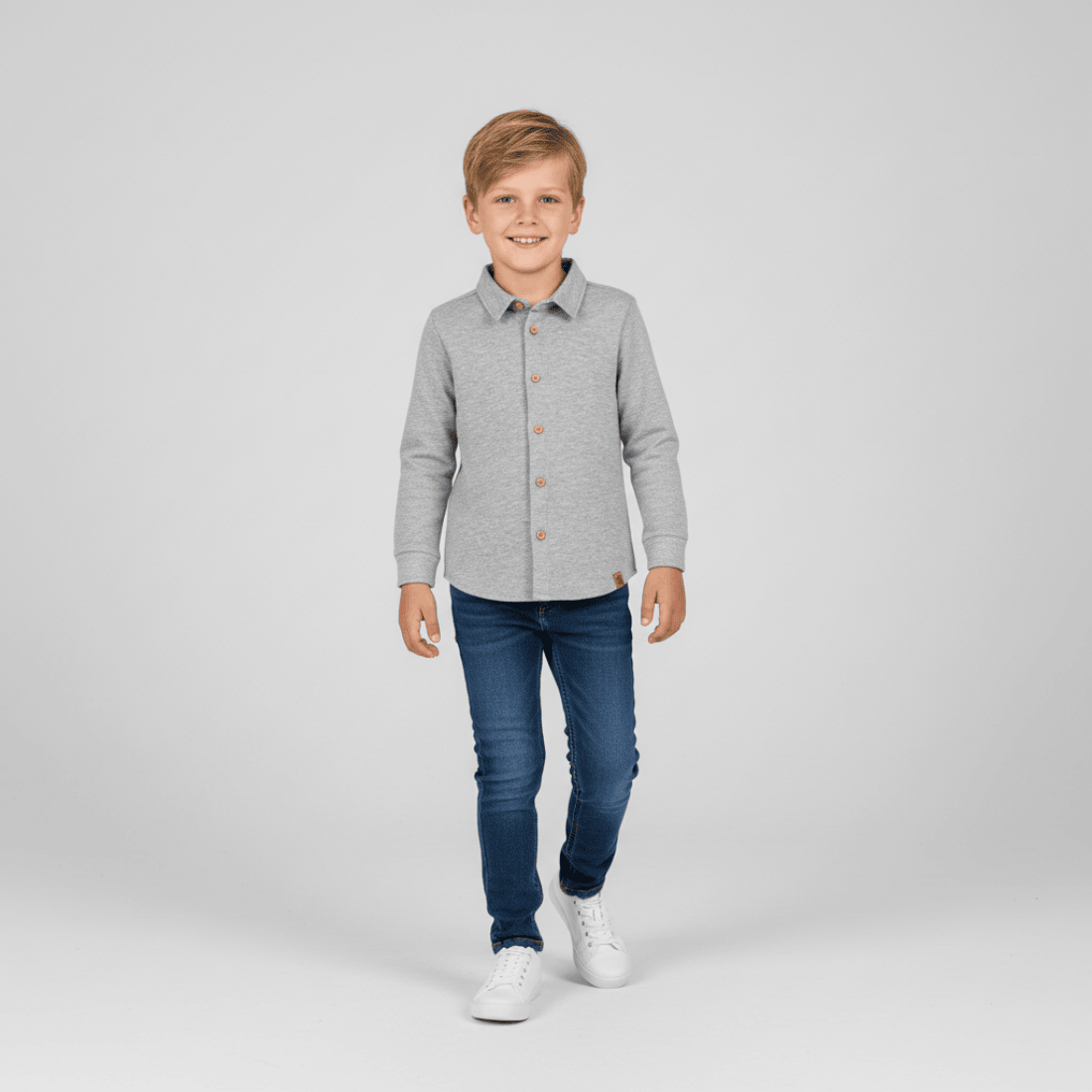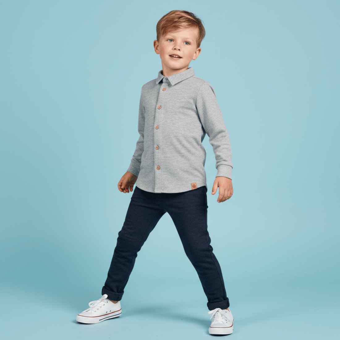 Stylowa koszula chłopięca z bawełny typu lacosta. Bardzo elegancka, a przy tym miękka i wygodna. Tego typu materiał jest nieco sztywniejszy niż bawełna dresowa, dzięki czemu lepiej się układa i zachowuje swój kształt. Koszula ma prosty fason z kołnierzykiem i tradycyjne zapięcie na drewniane guziczki. To propozycja zarówno do eleganckich spodni, jak i dżinsów. Pozostawiona rozpięta będzie doskonałym uzupełnieniem casualowej stylizacji.