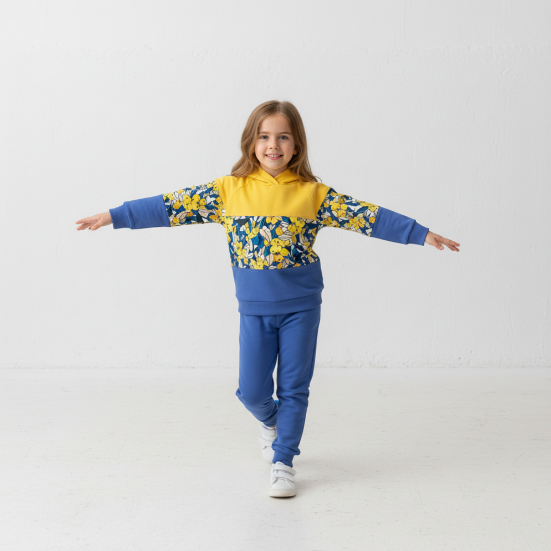 Kolorowa bluza dresowa z kapturem. Uszyta w Polsce, z najwyższej jakości bawełny, jest bardzo mięciutka, elastyczna i przewiewna. Doskonale sprawdza się w codziennej garderobie malucha. Bluza ma prosty, swobodny fason z głębokim kapturem wykończonym na zakładkę, dzięki czemu łatwiej się ją ubiera. Wykończona w żółtym i niebieskim kolorze, ozdobiona ciekawym motywem w żółtą jarzębinę, wspaniale wpisuje się w dziecięcą, kolorową garderobę. Jest to idealna propozycja do klasycznych dżinsów, do spodni dresowych, a także wygodnych legginsów.