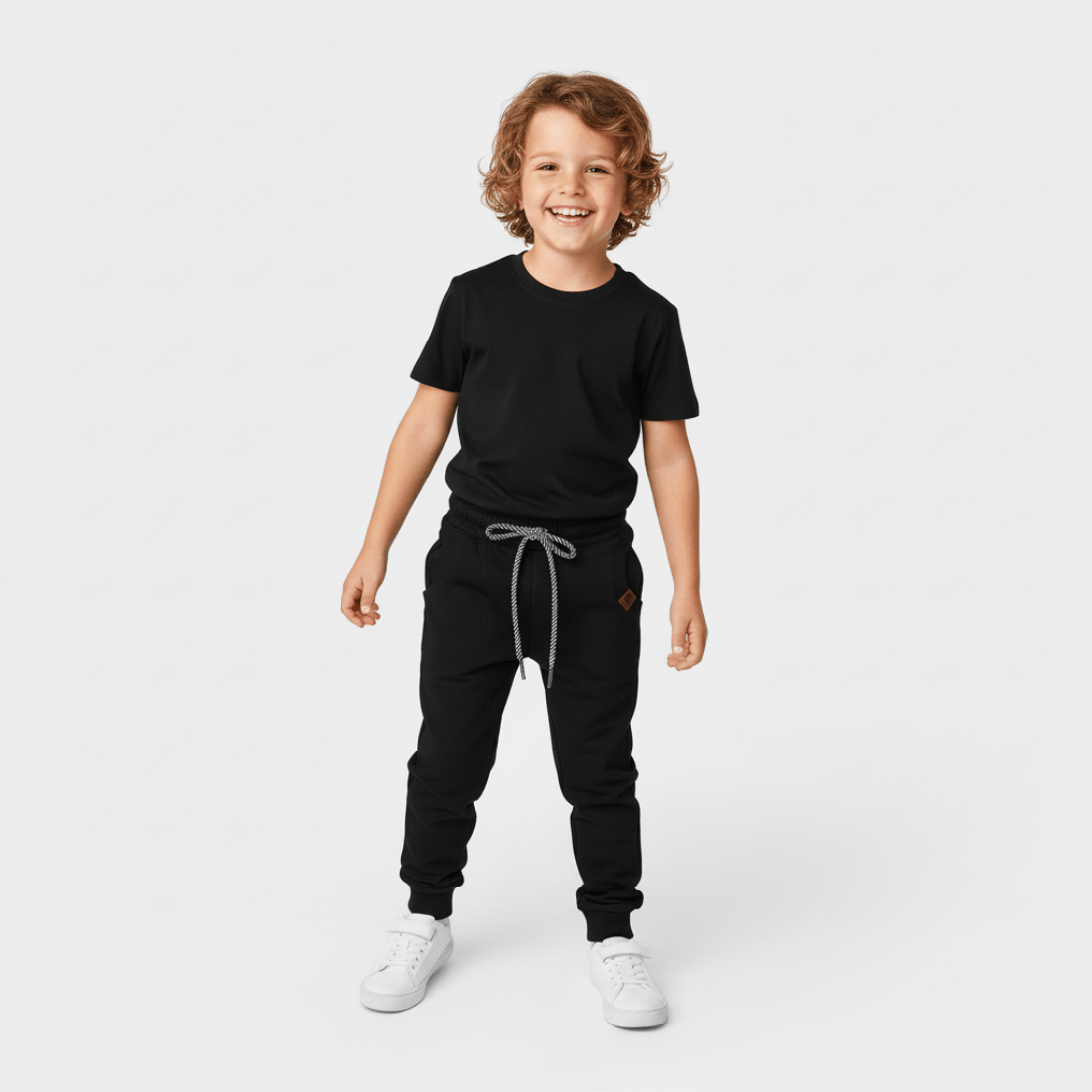 Czarne, wygodne spodnie dresowe uszyte w Polsce, z najwyższej jakości bawełny. Są bardzo mięciutkie, elastyczne i przewiewne, co jest ważne podczas aktywnych zabaw malucha. Spodnie mają delikatnie zwężane nogawki zakończone praktycznymi ściągaczami i elastyczną gumkę w pasie, którą dodatkowo można ściągnąć biało-czarnym troczkiem. Dwie kieszonki z przodu także zostały wykończone ściągaczem. Czarne spodnie dresowe z pewnością będą elementem często wykorzystywanym w garderobie malucha, są bardzo praktyczne i pasują do wielu innych kolorów.