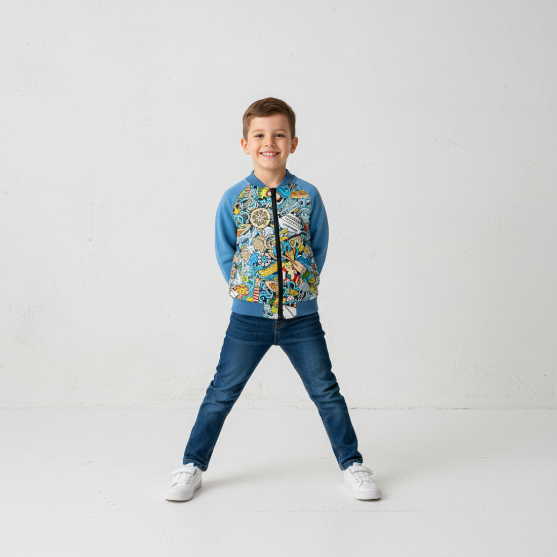 Niebieska bomberka dresowa uszyta w Polsce, z najwyższej jakości bawełny. Jest miękka, elastyczna i bardzo wygodna. Zapinana na praktyczny suwak sprawdza się znakomicie w codziennych stylizacjach, kiedy maluch często ubiera się i rozbiera w ciągu dnia. Bluza wykończona została ściągaczami i niewysoką stójką. Niebieski kolor uzupełniony o barwny, morski wzór pięknie wpisuje się w dziecięcą garderobę i na pewno przypadnie do gustu małym miłośnikom wodnych przygód.