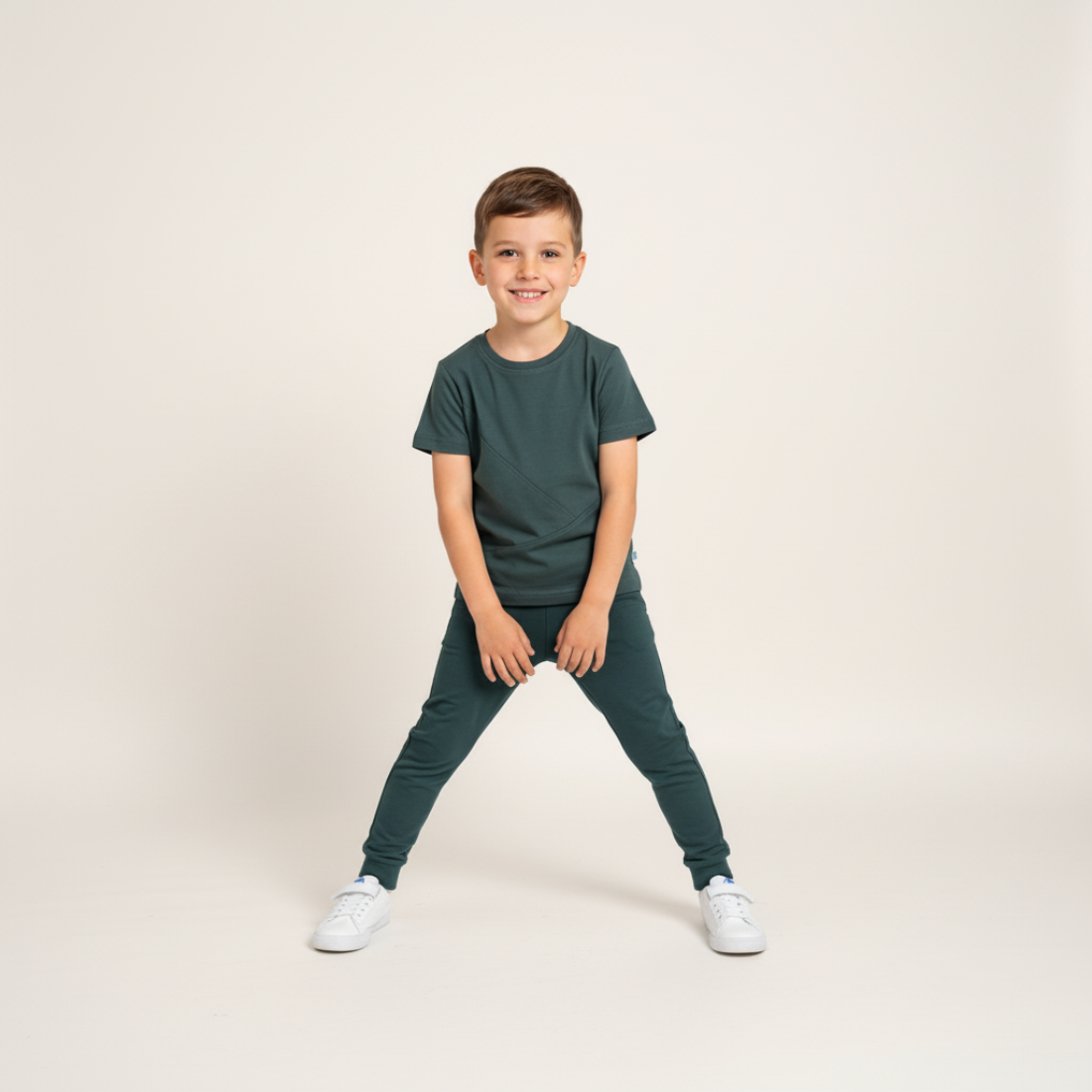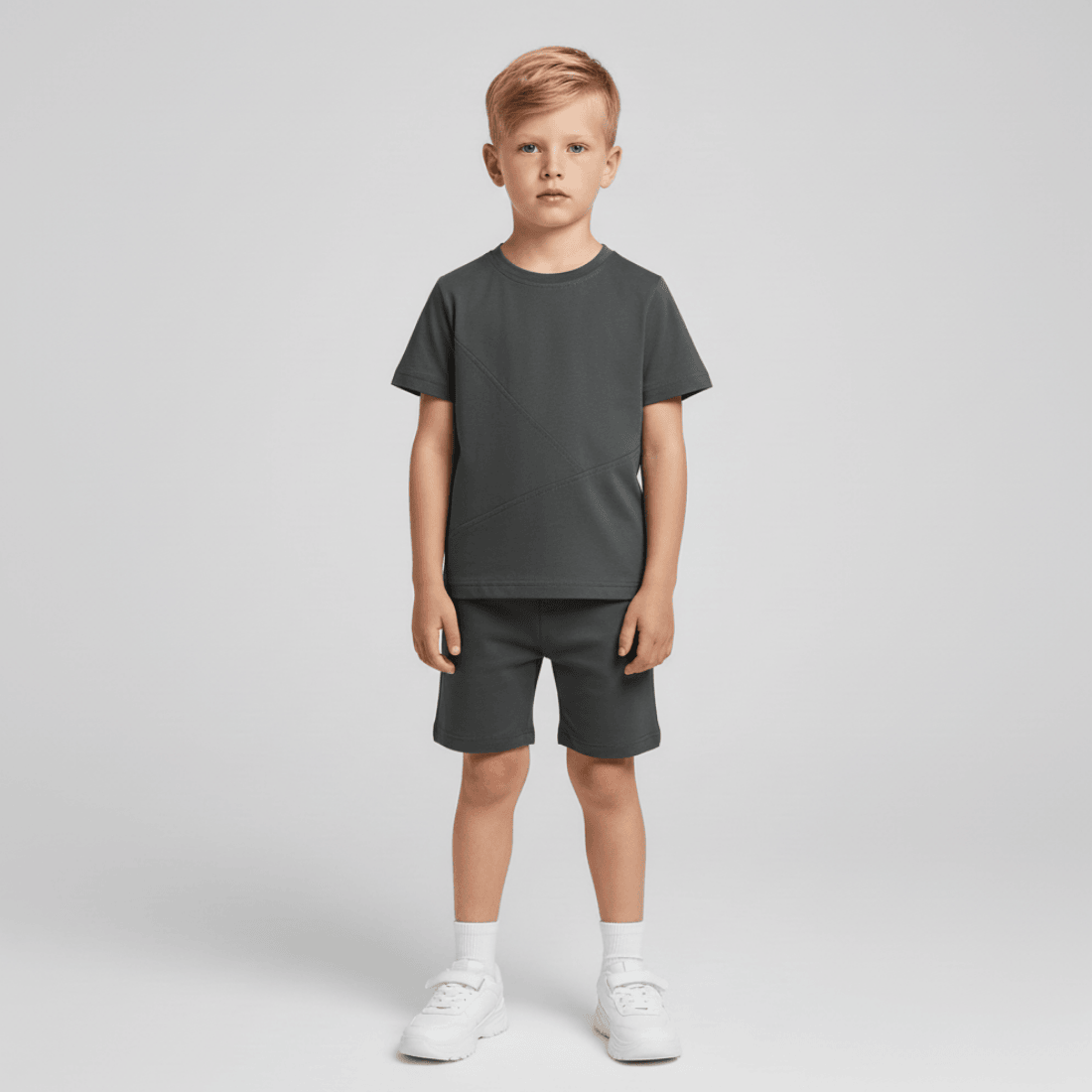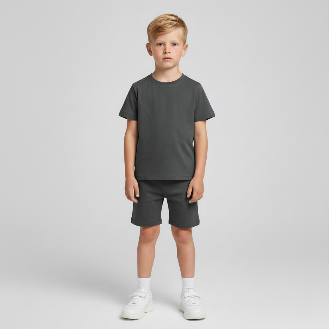 Grafitowa koszulka chłopięca z krótkim rękawkiem. Uszyta w Polsce, z najwyższej jakości bawełny, jest bardzo mięciutka, przewiewna i elastyczna. Doskonale sprawdza się latem, kiedy wybór naturalnych materiałów jest bardzo ważny. Zimą także będzie stanowiła doskonałą bazę do cieplejszych stylizacji. T-shirt ma prosty, praktyczny fason ozdobiony delikatnymi, geometrycznymi przeszyciami. Dzięki tej jednolitej, ciemnej kolorystyce, koszulkę bez problemu będzie można dopasować do wielu różnorodnych, ciekawych stylizacji.