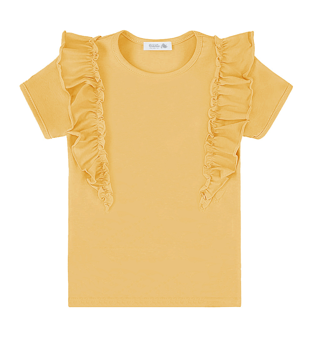 Żółta, elegancka koszulka dziewczęca z krótkim rękawkiem. Uszyta w polskiej szwalni, z najwyższej jakości bawełny, zachwyca swoimi precyzyjnymi wykończeniami, a także niezwykłą wygodą, jaką daje małej damie. Koszulka ma prosty, dopasowany fason z okrągłym dekoltem. Ozdobiona pionowymi falbankami na ramionach, prezentuje się znakomicie zarówno w stylizacjach casualowych, jak i eleganckich.