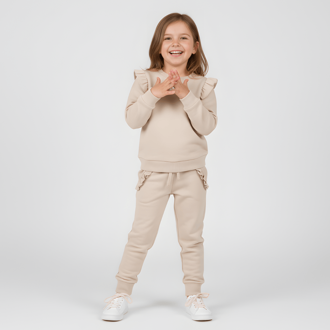 Dziewczęce spodnie dresowe uszyte w Polsce, z najwyższej jakości bawełny. Spodnie mają prosty fason z szeroką gumką w pasie i nogawkami zakończonymi szerokimi pasami materiału. Dzięki temu ich kształt pozostaje niezmieniony nawet przy częstym i intensywnym użytkowaniu. Elementami, które nadają spodniom dziewczęcego, subtelnego charakteru są malutka kokardka oraz efektowne falbanki, którymi obszyte zostały praktyczne kieszenie po bokach. Spodnie w uniwersalnym, beżowym kolorze dają wiele możliwości. Można łączyć je z wszystkimi kolorami tworząc oryginalne i wyjątkowe stylizacje każdego dnia. Dla efektu wow warto zestawić dresowe spodnie z elegancką bluzką ozdobioną falbankami. Taki zestaw na pewno przykuje uwagę każdego.