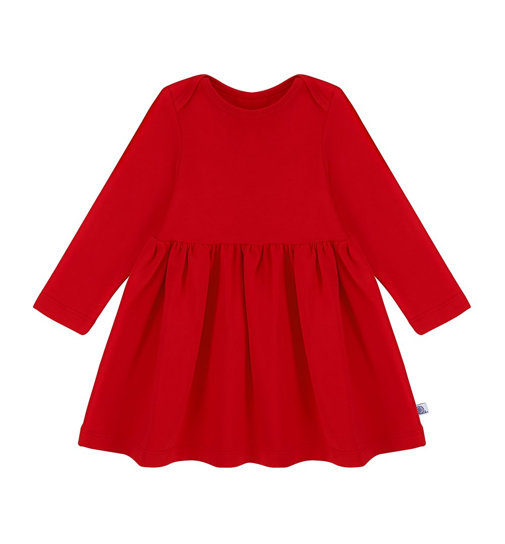 Jednolita, czerwona sukienka z długim rękawem. Uszyta w polskiej szwalni, z najwyższej jakości bawełny, jest mięciutka, bardzo wygodna i elastyczna. Sukienka ma dopasowaną górę z okrągłym dekoltem na zakładki, które znacznie ułatwiają ubieranie. Dół jest delikatnie rozkloszowany, dzięki czemu sukienka pięknie się układa podczas noszenia i obrotów, co na pewno spodoba się małym tancerkom. Czerwona sukienka to propozycja odpowiednia do codziennej garderoby, ale także wspaniały pomysł na stylizację świąteczną idealnie wpisującą się w klimat Bożego Narodzenia. Kupując jednolitą sukienkę w czerwonym kolorze można mieć pewność, że nie będzie to stylizacja na jedną okazję.