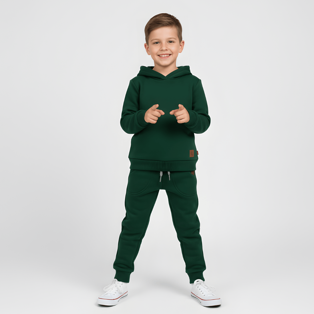 Zielone spodnie dresowe z ociepleniem. Uszyte w polskiej szwalni, z najwyższej jakości bawełny, są elastyczne, przyjemne w dotyku i bardzo wygodne. Spodnie mają szeroką, praktyczną gumkę w pasie, którą dodatkowo można ściągnąć troczkiem. Nogawki zostały zakończone ściągaczami, które wykorzystane zostały także, jako wykończenie okrągłych kieszeni. Ocieplane spodnie dresowe to idealny wybór na zimowe szaleństwa na placu zabaw. Warto uzupełnić o nie dziecięcą garderobę.