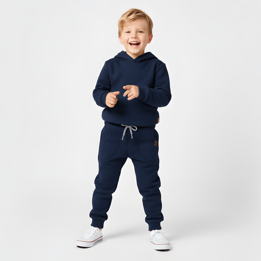 Ocieplane spodnie dresowe dla chłopca. Uszyte w Polsce, z najwyższej jakości bawełny, są nie tylko bardzo wygodne, ale też stylowe. Spodnie mają szeroką, elastyczną gumkę w pasie, którą dodatkowo można ściągnąć troczkami. Ich nogawki zostały zakończone praktycznymi ściągaczami, które stanowią także dekoracyjne wykończenie okrągłych kieszeni. Granatowe spodnie dresowe to praktyczny wybór, bez problemu można dopasować je do wielu bluz w róznych kolorach. Te ocieplane dresy na pewno przydadzą się podczas kompletowania garderoby na ferie zimowe.