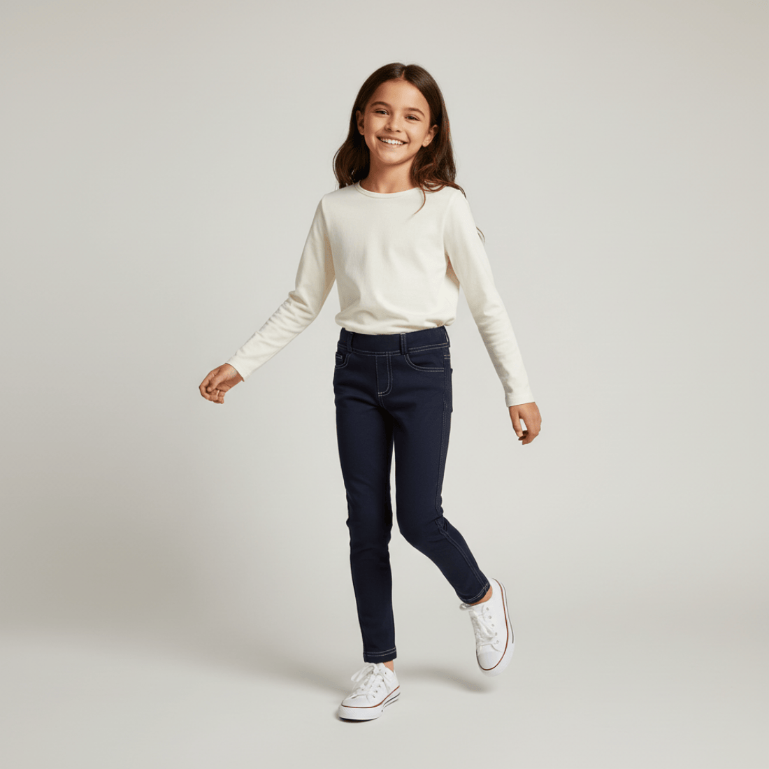 Stylowe jegginsy dziewczęce uszyte w Polsce, z najwyższej jakości bawełny, miękkiej, elastycznej i przewiewnej. Spodnie w ciemnogranatowym kolorze, z jasnymi szwami, szlufkami w pasie i imitacją kieszeni wyglądają, jak klasyczne spodnie jeansowe, ale są tak wygodne, jak spodnie dresowe. Właśnie to połączenie ciekawego stylu i komfortu noszenia sprawia, że dziewczynki chętnie sięgają po tego typu spodnie. Jak nosić jegginsy? Możliwości jest wiele. W połączeniu z bluzą z kapturem będą tworzyły sportową, miejską stylizację. W zestawieniu z elegancką bluzką można wykorzystać je np. podczas szkolnego apelu.