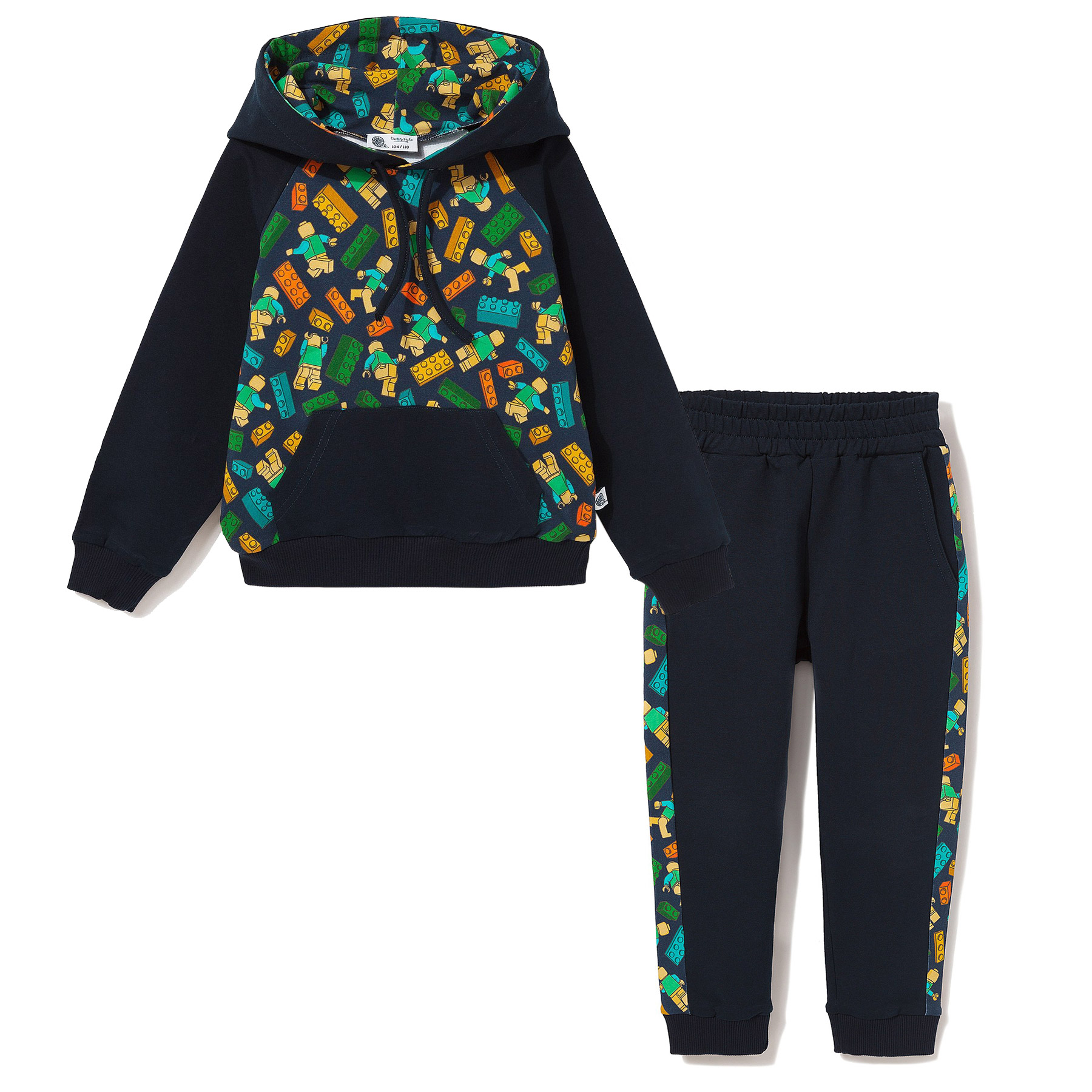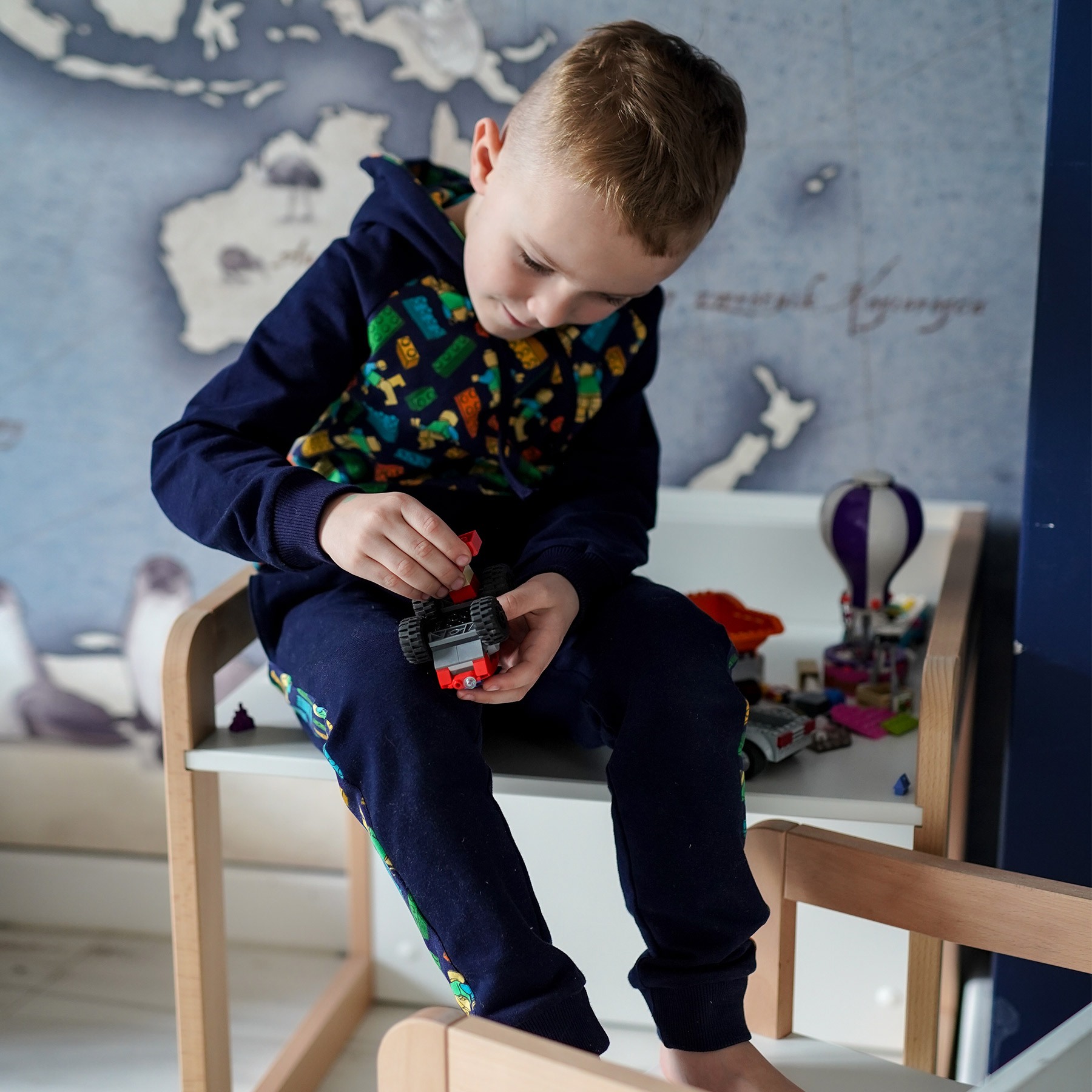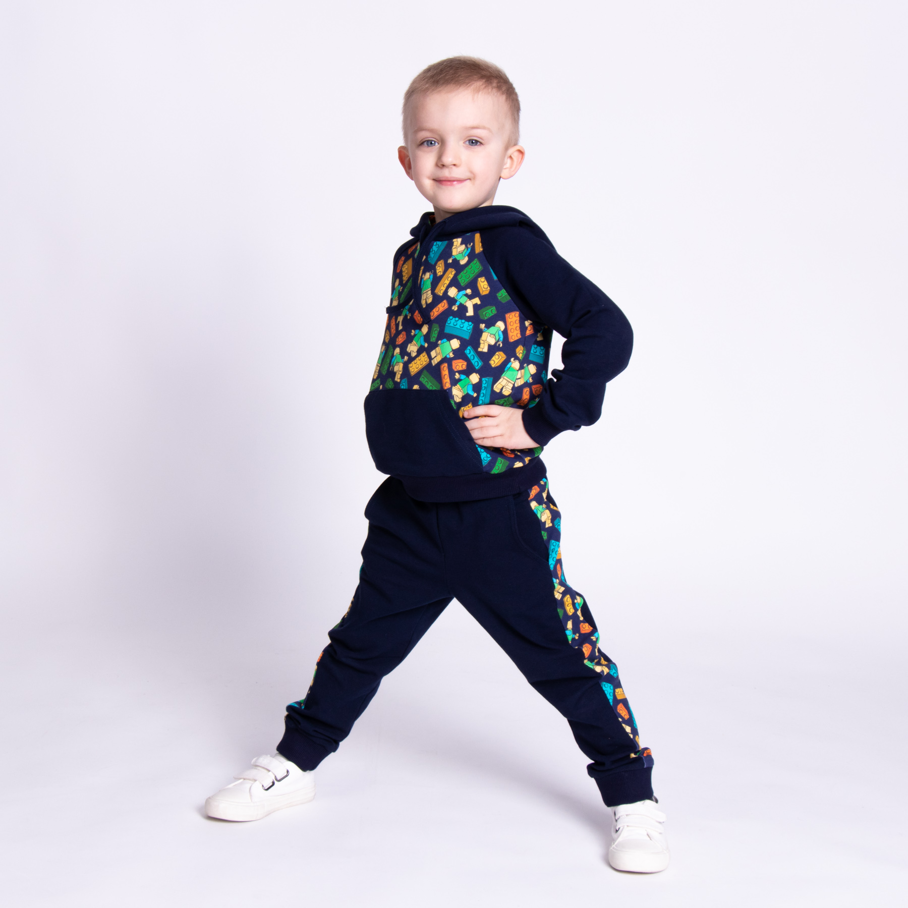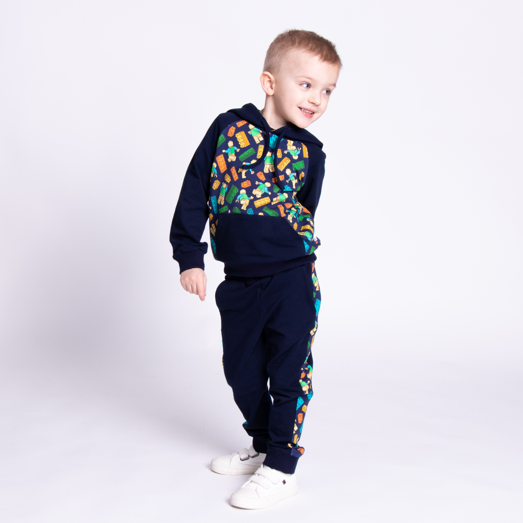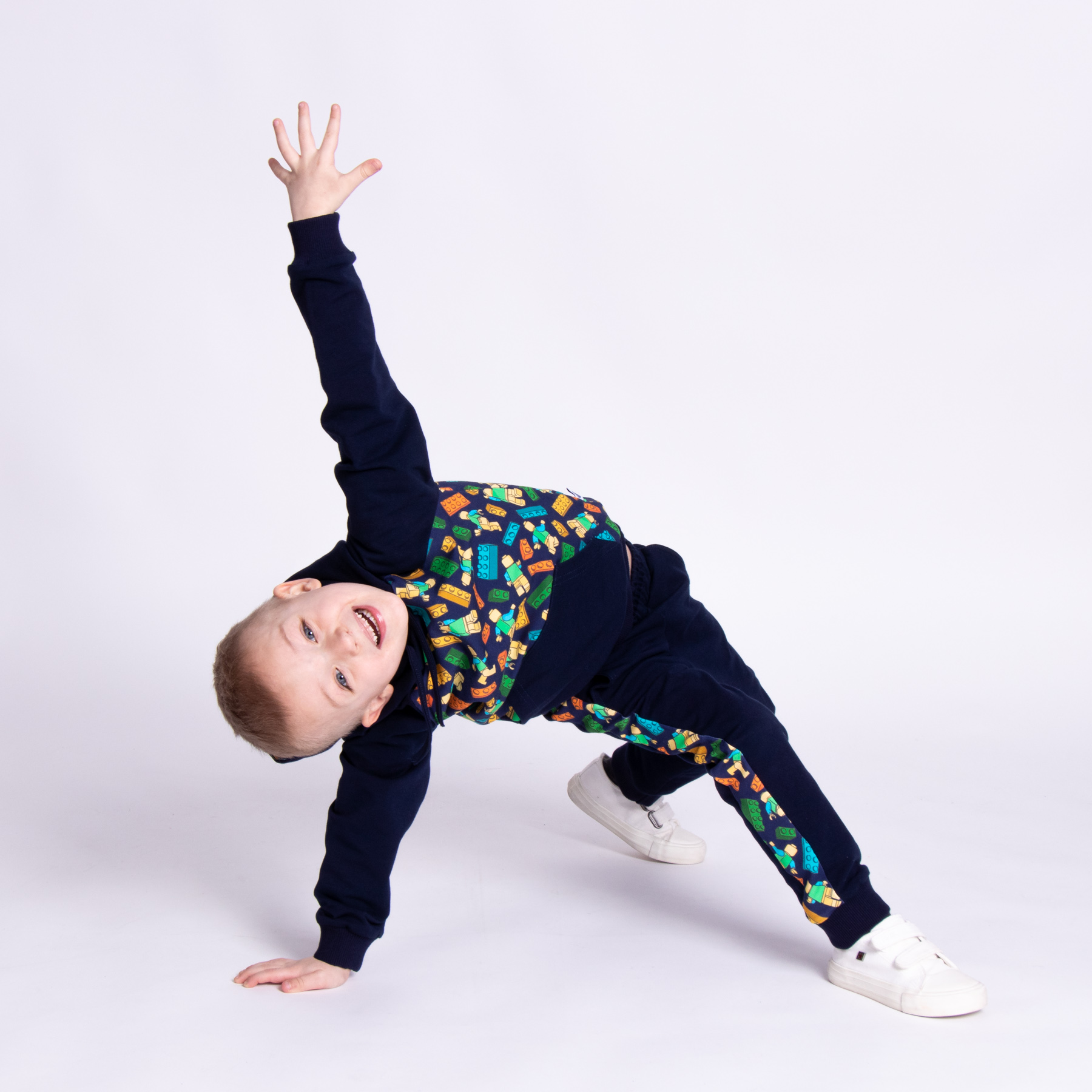 Bawełniany dres chłopięcy z kolorowym motywem w klocki Lego. Zestaw uszyty w polskiej szwalni, z dbałością o każdy detal, jest bardzo efektowny, a przy tym wygodny i przyjemny w dotyku. Luźna bluza dresowa z głębokim kapturem zapewnia dziecku pełną swobodę ruchów. Z przodu posiada dużą kieszeń typu "kangur". Dołączone do zestawu spodnie mają elastyczną gumkę w pasie i ściągacze na nogawkach, które ułatwiają dopasowanie spodni do wzrostu dziecka. Ten granatowy zestaw dresowy na pewno przypadnie do gustu każdemu miłośnikowi klocków.