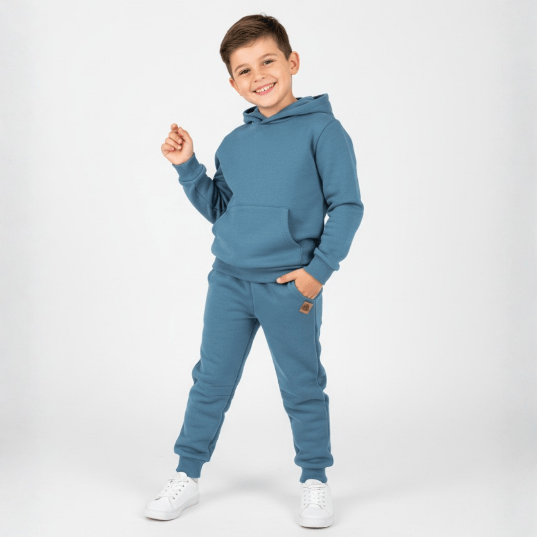 Wygodne spodnie dresowe ze ściągaczami. Uszyte w Polsce, z najwyższej jakości bawełny, są mięciutkie, bardzo wygodne, elastyczne i przewiewne, co na pewno zostanie docenione podczas długich godzin zabawy na świeżym powietrzu. Spodnie mają szeroką, elastyczną gumkę w pasie, która nie przekręca się podczas noszenia. Do tego dwie duże kieszenie z przodu i dwie mniejsze z tyłu. Nogawki są zakończone wysokimi ściągaczami, dzięki czemu spodnie mogą rosnąć razem z dzieckiem. Spodnie mają ciekawy, nieczęsto spotykany kolor bluestone, który łączy w sobie kolor niebieski z domieszką szarości.