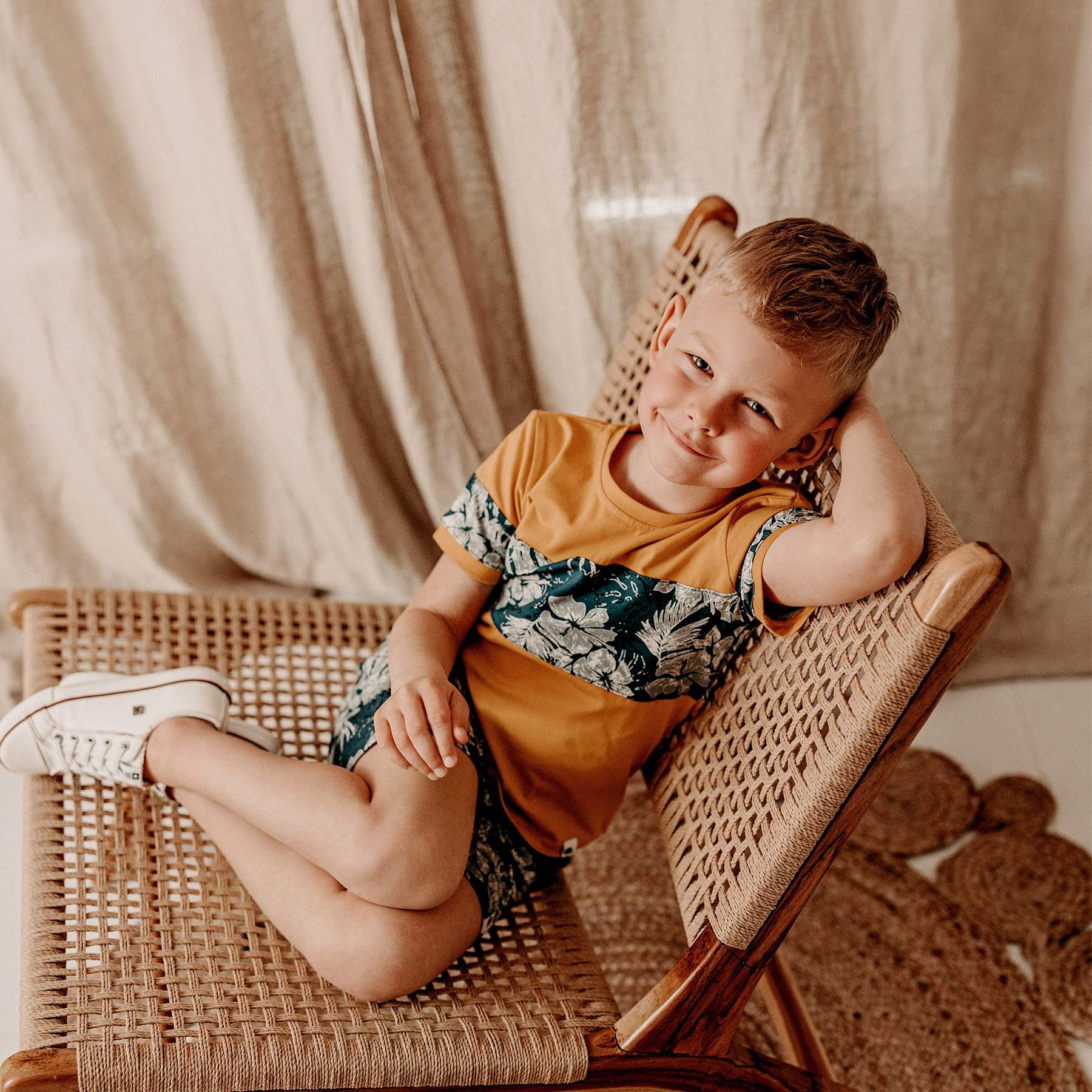 Koszulka chłopięca w żółtym kolorze to wybór ciekawy i wyrazisty, a w połączeniu z oryginalnym, kwiatowym motywem także bardzo designerski. Ciepły odcień żółtego wprowadza do garderoby chłopca odrobinę słonecznego nastroju, a motyw kwiatów przenosi go wprost na hawajską wyspę. Czy w takiej koszulce można mieć zły nastrój? Raczej nie, więc to lato w koszulce Hawaian zapowiada się bardzo radośnie.