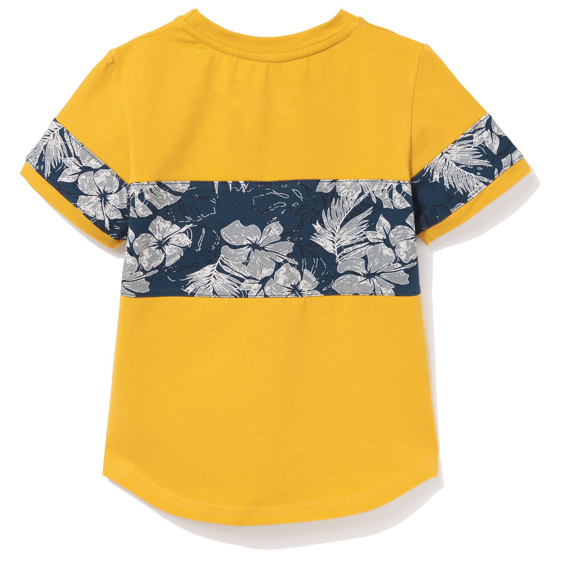 Koszulka ma prosty, swobodny fason z zaokrąglonym dołem, który ładnie układa się na spodniach. Okrągły dekolt oraz rękawy zostały wykończone dresowym ściągaczem, dzięki niemu materiał nie rozciąga się i zachowuje swój pierwotny kształt na długi czas, także po wielu praniach. Na pranie odporny jest także piękny żółty kolor oraz kwiaty wzór, więc bez obaw można nosić koszulkę tak często, jak tylko to możliwe.