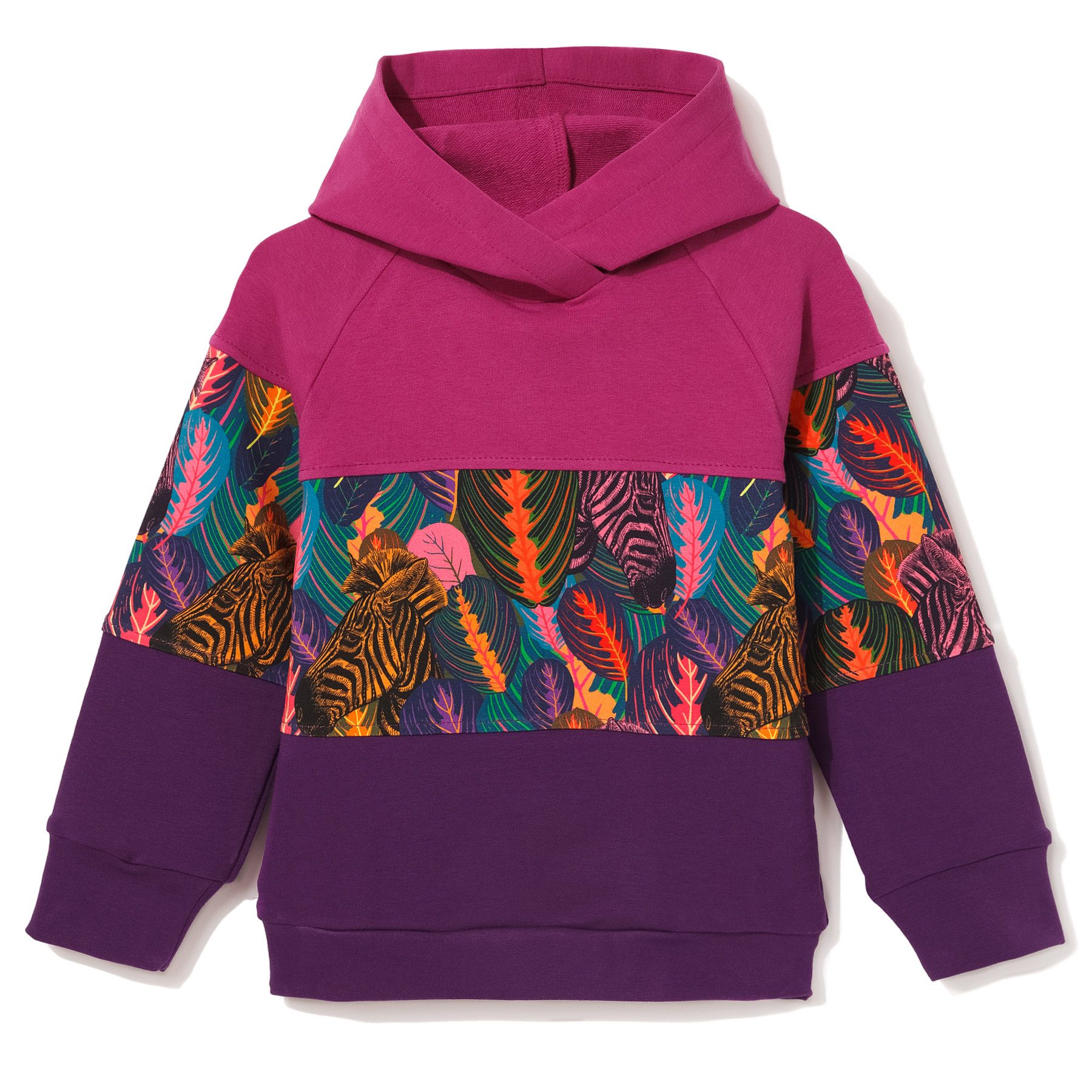 Fioletowa bluza dresowa dla dziewczynki. Uszyta w polskiej szwalni, z najwyższej jakości bawełny. Bluza jest bardzo wygodna, mięciutka i elastyczna, co ma szczególne znaczenie w dziecięcej garderobie, która musi być komfortowa w każdej sytuacji. Prosty fason z głębokim kapturem to wspaniała propozycja do codziennych stylizacji. Bluza została wykończona szerokimi, bawełnianymi mankietami, dzięki czemu zachowuje swój kształt nawet przy częstym użytkowaniu i praniu. Nie trzeba obawiać się także o jej kolor i jakość wzoru, nadrukowany metodą cyfrową jest bardzo trwały. Bluza z kolorowymi zebrami spodoba się każdej dziewczynce i chętnie będzie noszona do szkoły czy do przedszkola. Wspaniale komponuje się ze spodniami z takim samym motywem, a także z prostymi dżinsami w jasnym odcieniu.