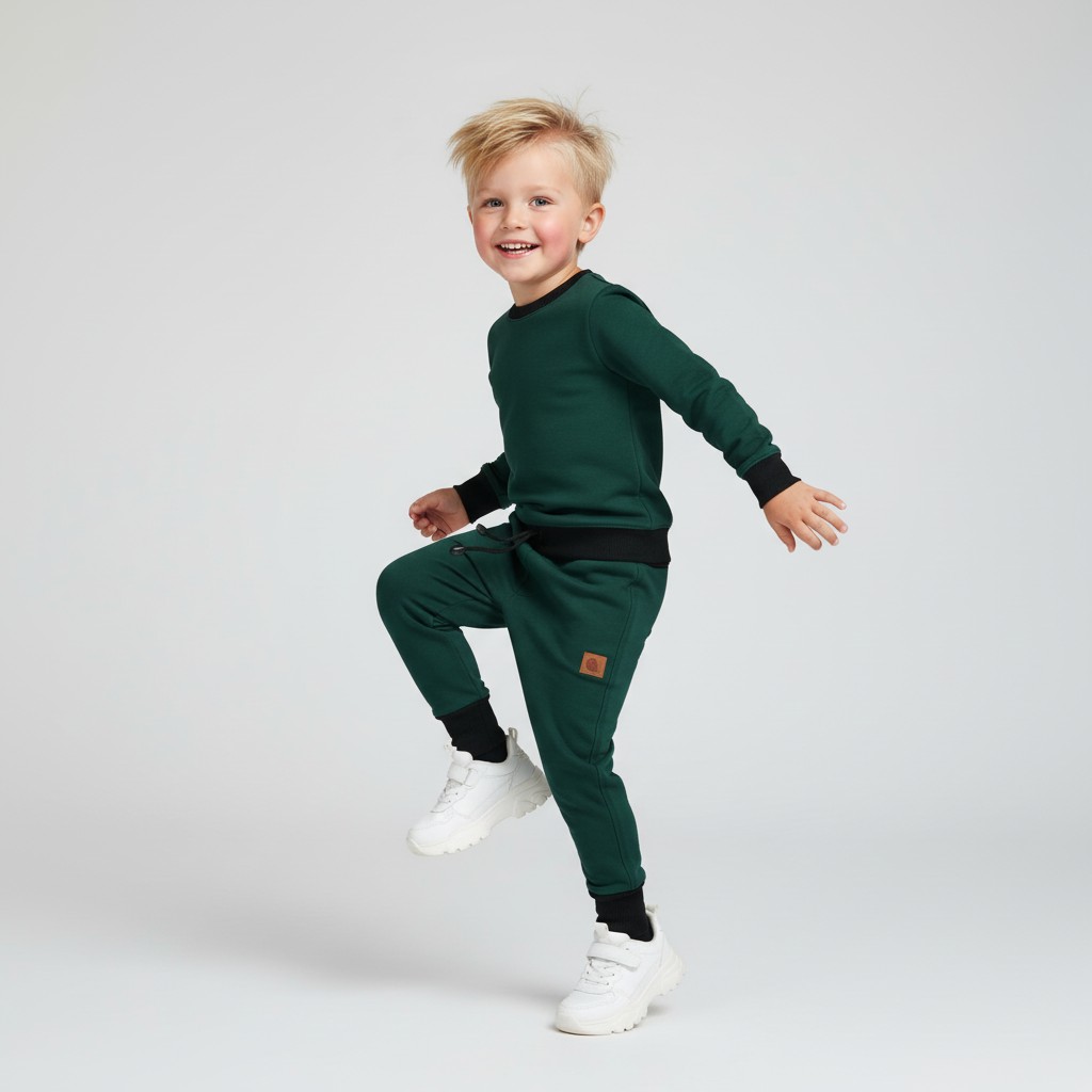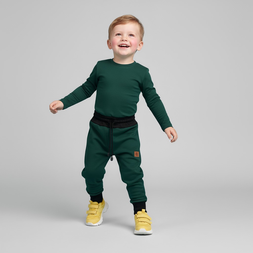 Zielone, wygodne spodnie uszyte z trwałej, wiatroodpornej tkaniny zwanej softshell. Materiał ten składa się z trzech warstw: -zewnętrznej z poliestru, -membrany, -wewnętrznej z krótko strzyżonego polaru. Spodnie są całkowicie wiatroodporne, ale przy tym oddychające. Nie trzeba martwić się, że maluszek będzie się przegrzewał. Do tego, w pewnej mierze są też wodoodporne, a to za sprawą impregnacji DWR, dzięki której materiał, przez pewien czas nie chłonie wody i zanieczyszczeń. Spodnie mają delikatnie podwyższony stan, by chronić plecy przed przewianiem. Do tego bawełniany pas z elastyczną gumką i sznureczkiem, którym można regulować ich obwód. Nogawki wykończone szerokimi ściągaczami łatwo włożyć do ciepłych, wysokich bucików, a gumki pod stopami zapobiegają wysuwaniu się spodni. Zielone spodnie softshell są bardzo praktyczne i trwałe. Szwy zostały wzmocnione dodatkowymi przeszyciami, więc żadna przygoda nie będzie im straszna.