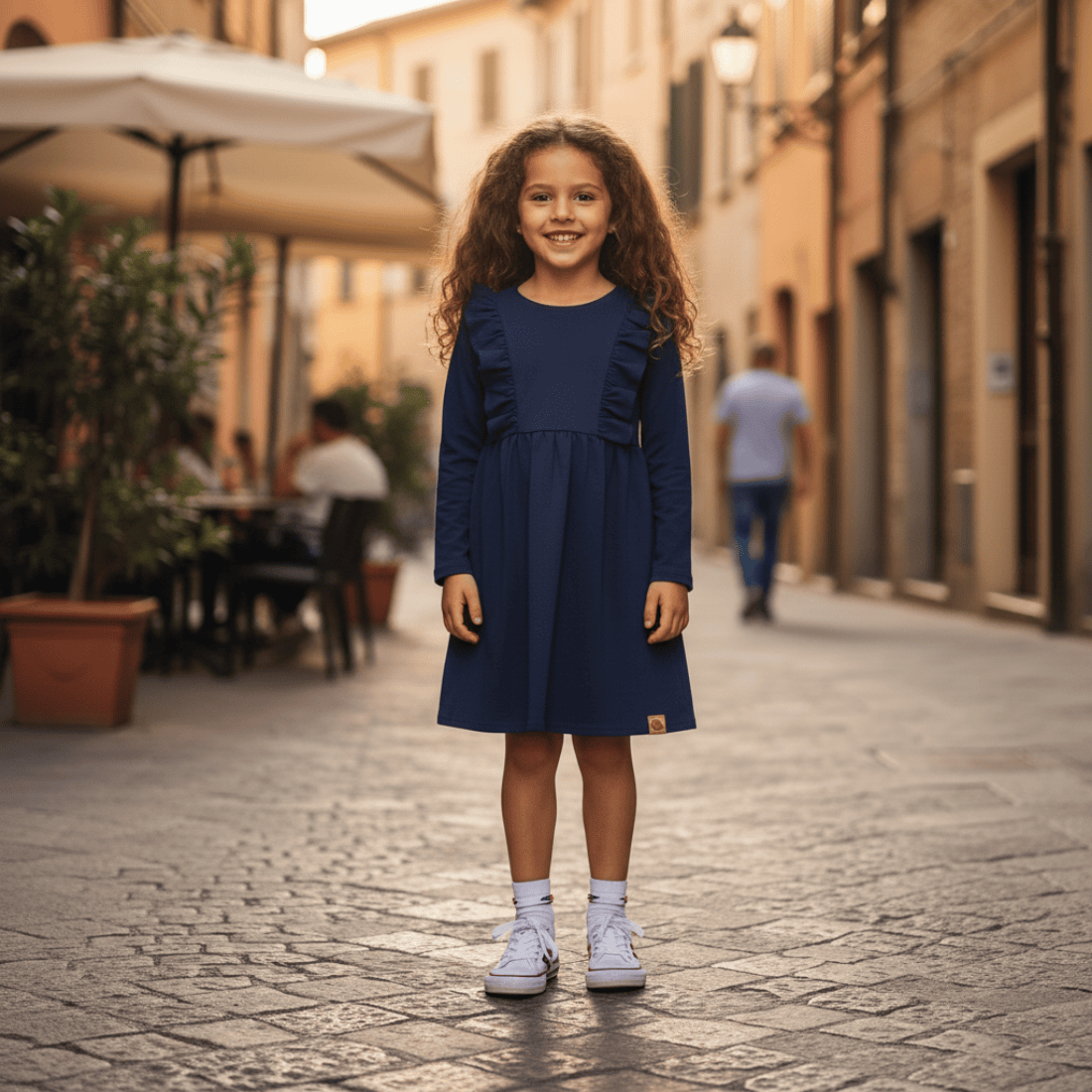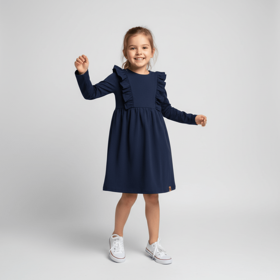 Gustowna sukienka dziewczęca z długim rękawem. Uszyta w Polsce, z najwyższej jakości bawełny, jest niezwykle wygodna, przyjemna w dotyku i elastyczna. Sukienka zapinana na guziki z tyłu, jest dopasowana na górze i delikatnie rozkloszowana od talii w dół. Ozdobiona pionowymi falbankami prezentuje się wyjątkowo szykownie. Sukienkę w granatowym kolorze można uzupełnić o elegancki sweterek idealny na specjalne okazje lub casualową, dżinsową kurteczkę, doskonałą na co dzień. W końcu tak wygodny strój szkoda byłoby nosić tylko od święta.