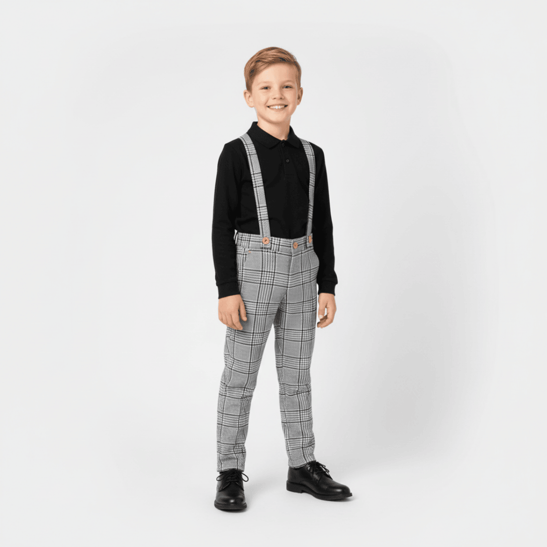 Wygodne i eleganckie spodnie uszyte z wysokiej jakości bawełny. Spodnie mają klasyczny, prosty fason, który wspaniale prezentuje się w oficjalnych stylizacjach, ale wygodą nie odbiegają od zwykłych spodni dresowych. Są bardzo elastyczne, dobrze się układają i nie krępują ruchów. Gumka w pasie dobrze je utrzymuje i nie uciska brzuszka. Dodatkowo mają materiałowe szelki zapinane na dekoracyjne, drewniane guziczki.