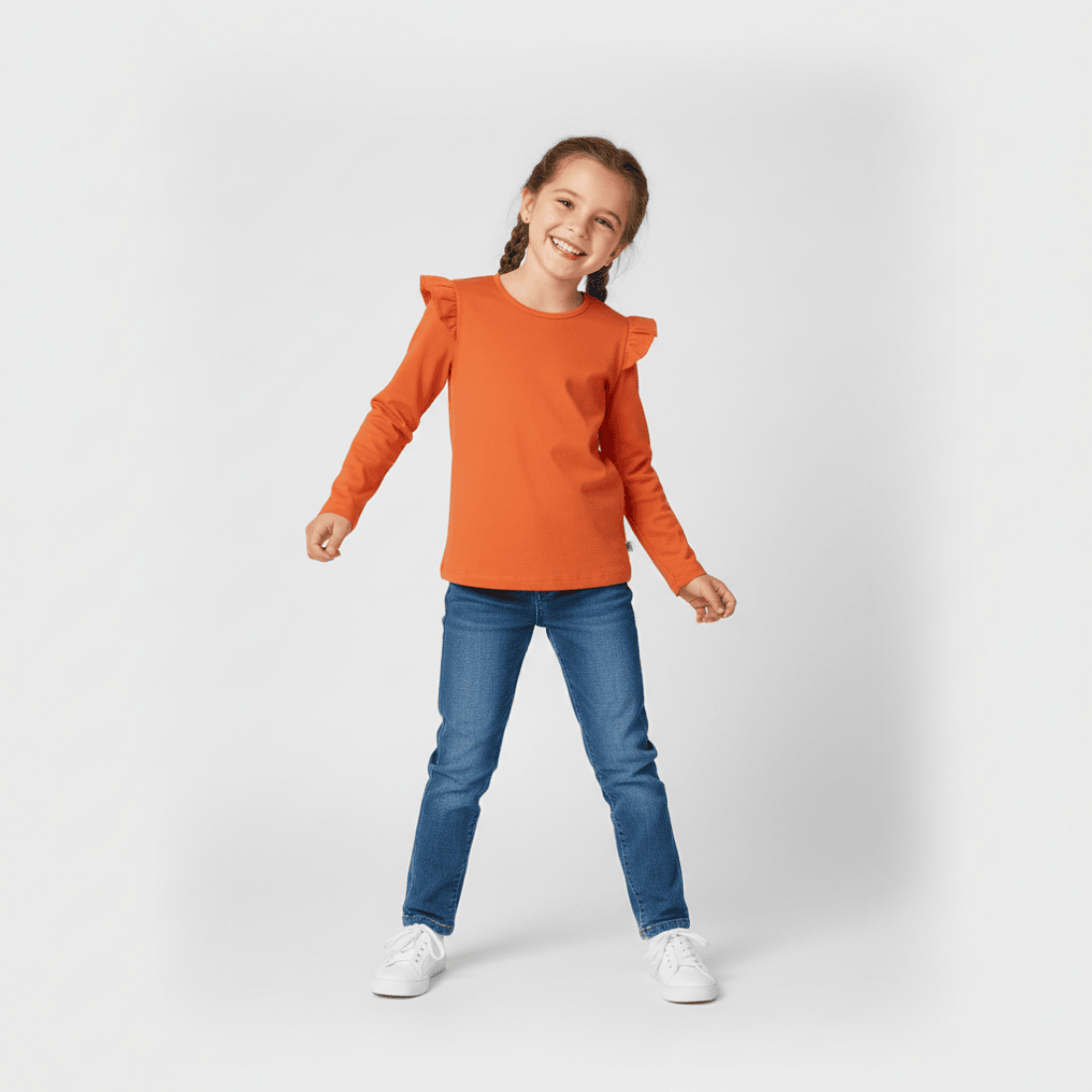 Efektowna bluzka z długim rękawem uszyta z wysokiej jakości bawełny z niewielką domieszką elastanu, dzięki któremu materiał jest bardziej elastyczny i wygodniejszy. Dzianina posiada certyfikat Oeko-Tex Standard 100 Tekstylia godne zaufania, który potwierdza jej wysoką jakość. Klasyczny model z okrągłym dekoltem został nieco odświeżony poprzez dodanie dekoracyjnych, falbanek na ramionach.