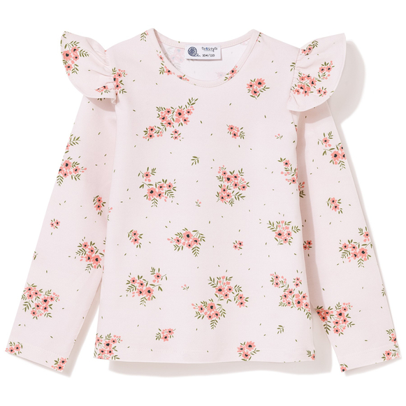 Bluzka ma prosty fason z okrągłym dekoltem i długim rękawem. Na ramionach umieszczone zostały dekoracyjne falbanki, które nadają jej bardziej eleganckiego charakteru.