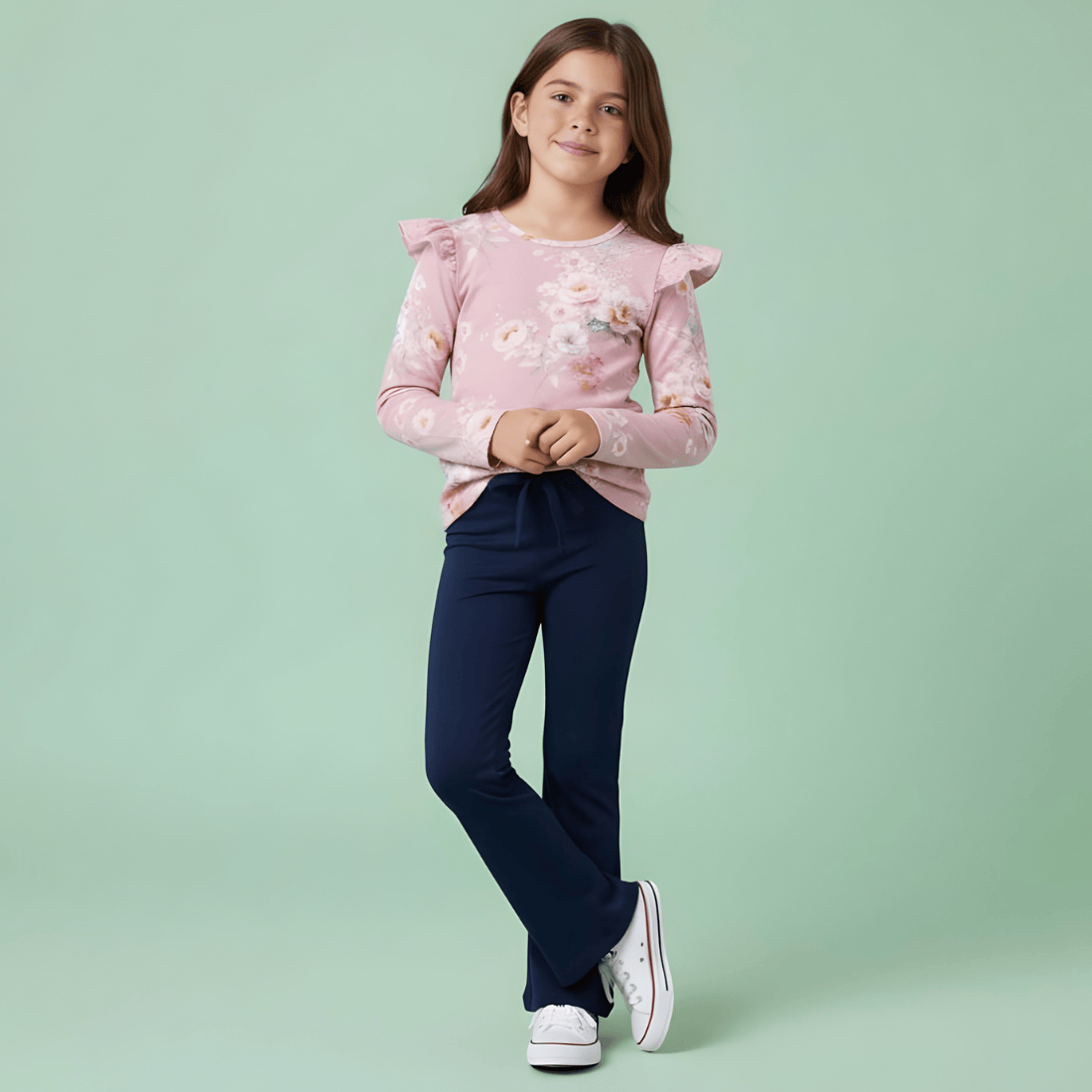 Bluzka ma prosty fason z długim rękawem i dekoracyjnymi falbankami na ramionach. Jest to model, który doskonale dopasowuje się do dziewczęcej sylwetki, nie krępując jej ruchów i zapewniając pełną swobodę noszenia.