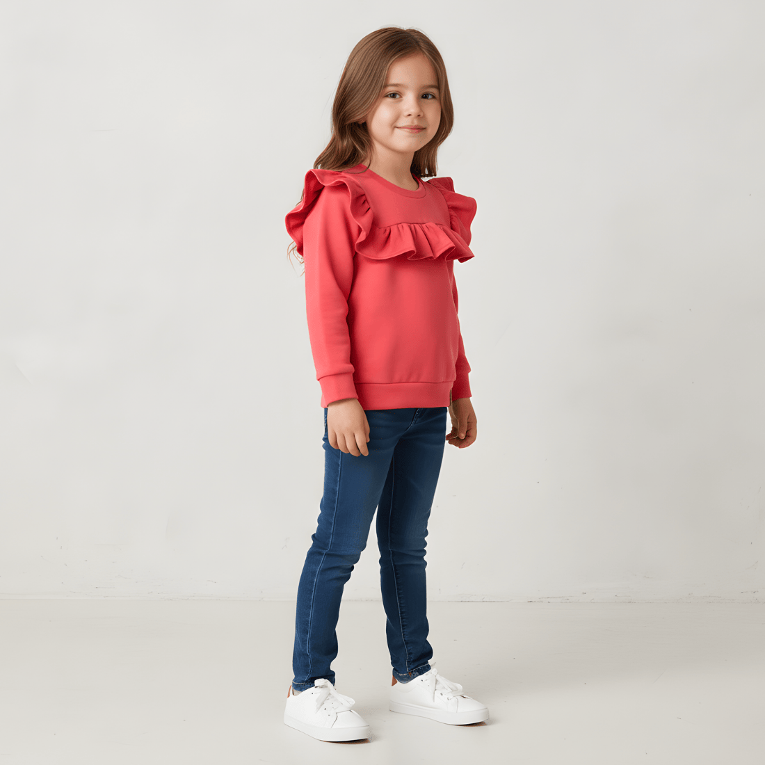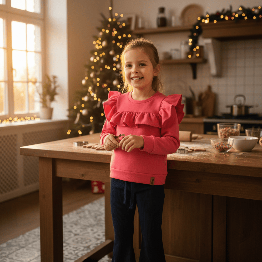 Koralowa bluza dresowa wkładana przez głowę. Uszyta w polskiej szwalni, z najwyższej jakości bawełny, jest miękka, bardzo wygodna i przewiewna. Bluza ma prosty fason, dzięki czemu jest chętnie wybierana przez dziewczynki, nie krępuje ruchów i nie przeszkadza podczas zabawy. Obszycia z materiału sprawiają, że kształt bluzy zostaje zachowany nawet przy intensywnym użytkowaniu. Ozdobiona pięknymi i efektownymi falbankami nadaje każdej stylizacji bardzo dziewczęcego i subtelnego charakteru. To propozycja zarówno do strojów sportowych, jak i eleganckich.