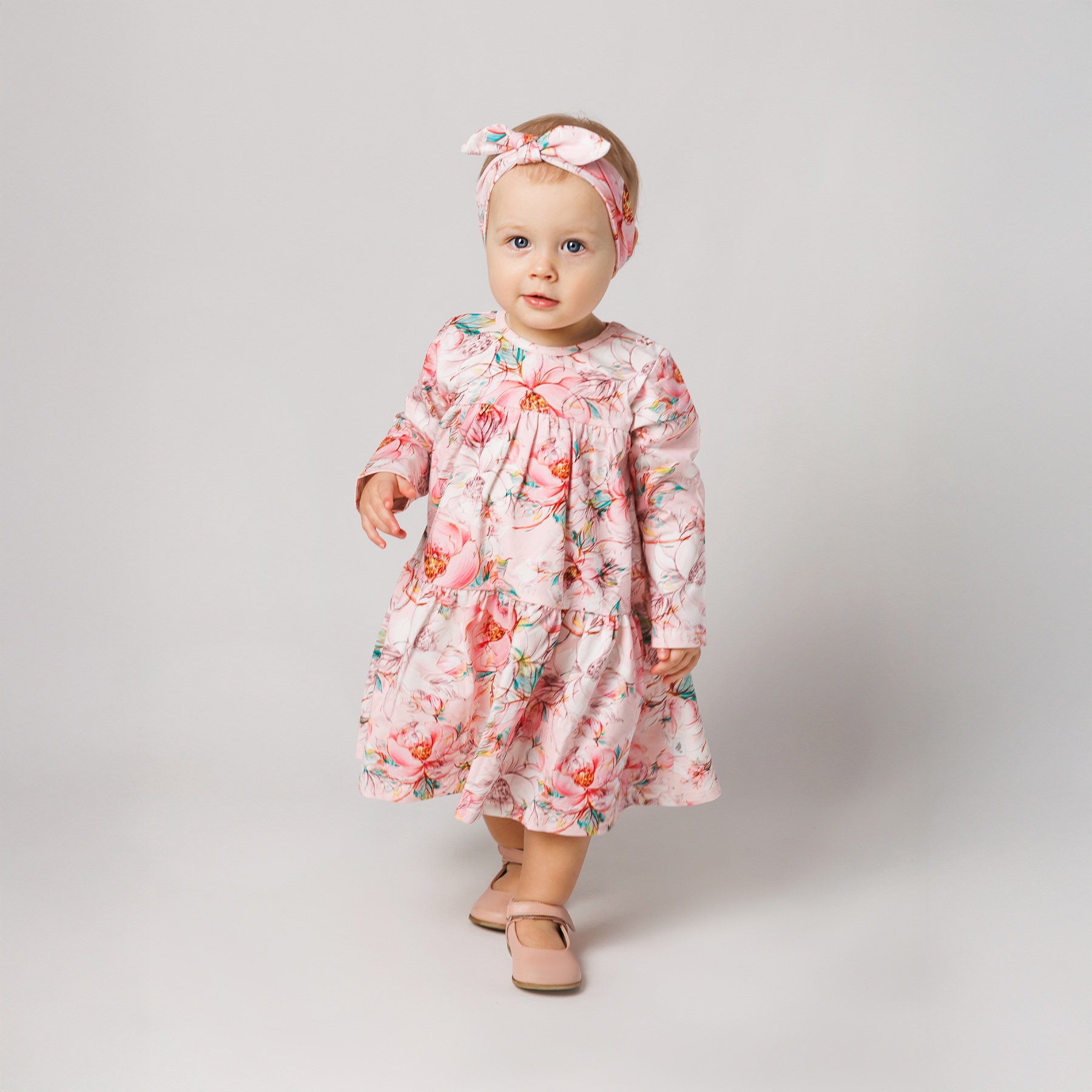 Elegancka sukienka niemowlęca z długim rękawem. Uszyta w Polsce, z wysokiej jakości bawełny, jest bardzo mięciutka i przyjemna w dotyku. Dzięki niewielkiemu dodatkowi elastanu, materiał jest też bardzo elastyczny i doskonale dopasowuje się do maluszka. Sukienka ma długi rękaw i jest mocno rozkloszowana, ozdobiona dwoma przeszyciami prezentuje się niezwykle elegancko. Kwiecista sukienka to wspaniała propozycja na różnego rodzaju uroczystości i okazje.