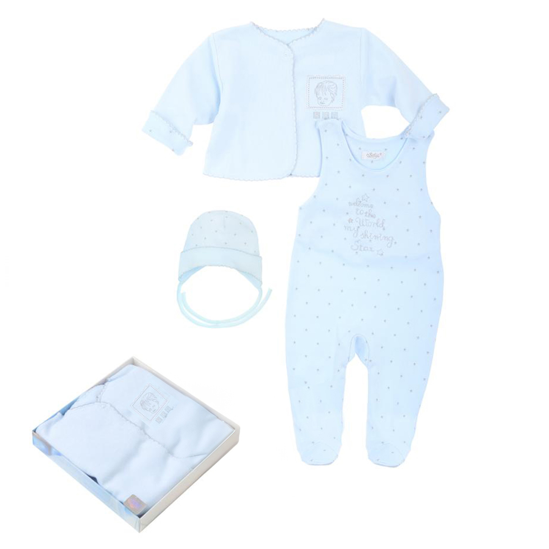 Komplet niebieski dla niemowlaka z bawełny supima. Pakowany w pudełko. Idealny na prezent.