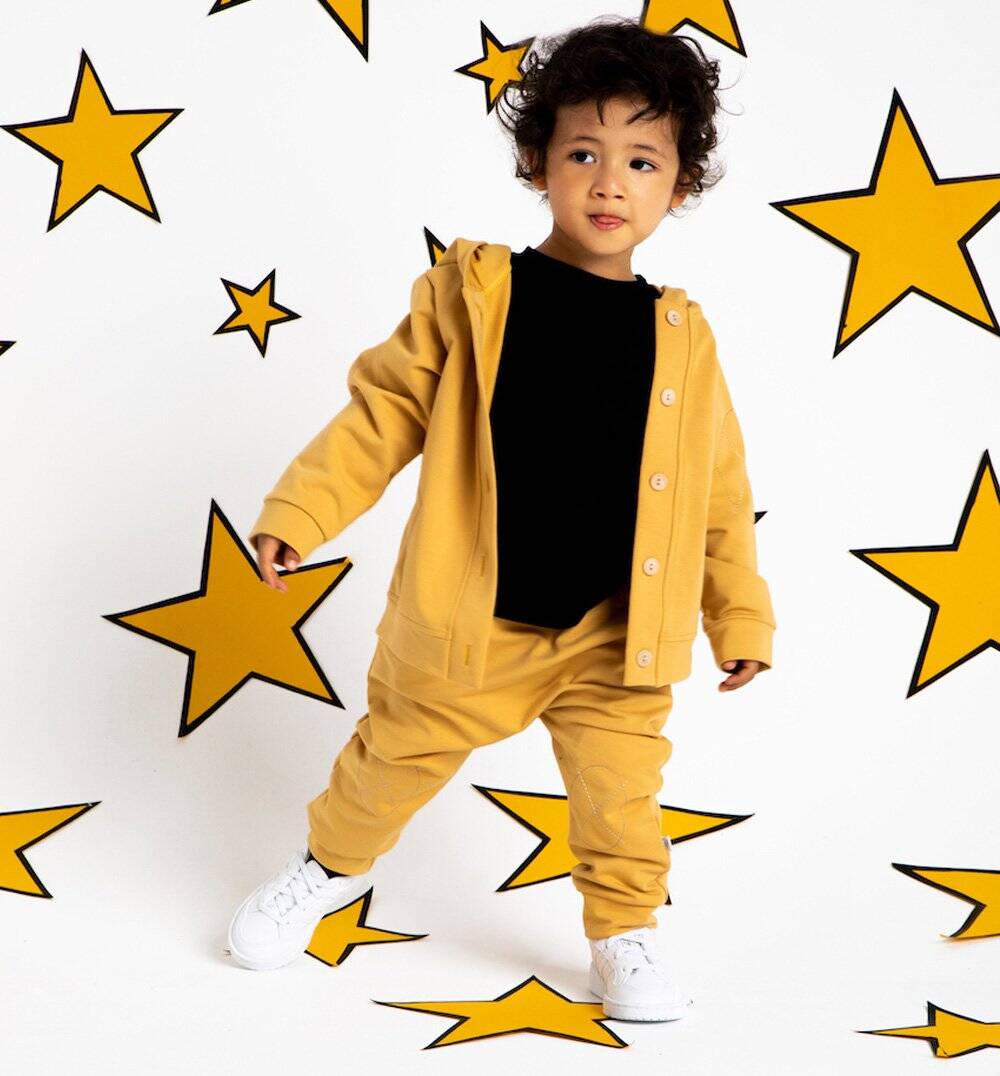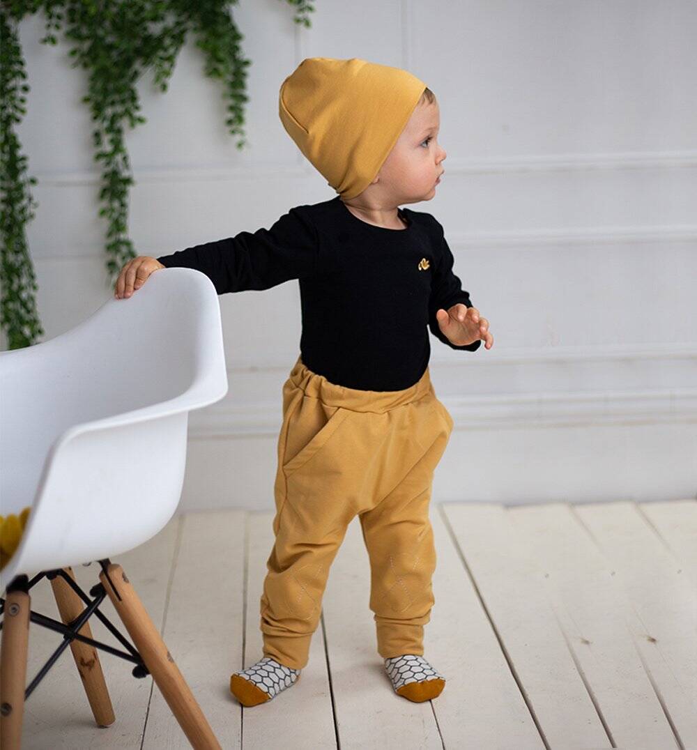 Wygodne, długie spodnie dresowe uszyte z wysokiej jakości bawełny sprawdzają się doskonale w codziennym użytkowaniu. Nie krępują ruchów, nie uwierają i dopasowują się do maluszka. Elastyczna gumka w pasie nie uciska brzuszka. Spodnie mają dwie otwarte kieszonki i dekoracyjne przeszycia na kolanach. Musztardowy odcień pięknie komponuje się z brązem, zielenią, granatem i wieloma innymi kolorami, więc stworzenie stylizacji z tymi spodenkami będzie czystą przyjemnością.
