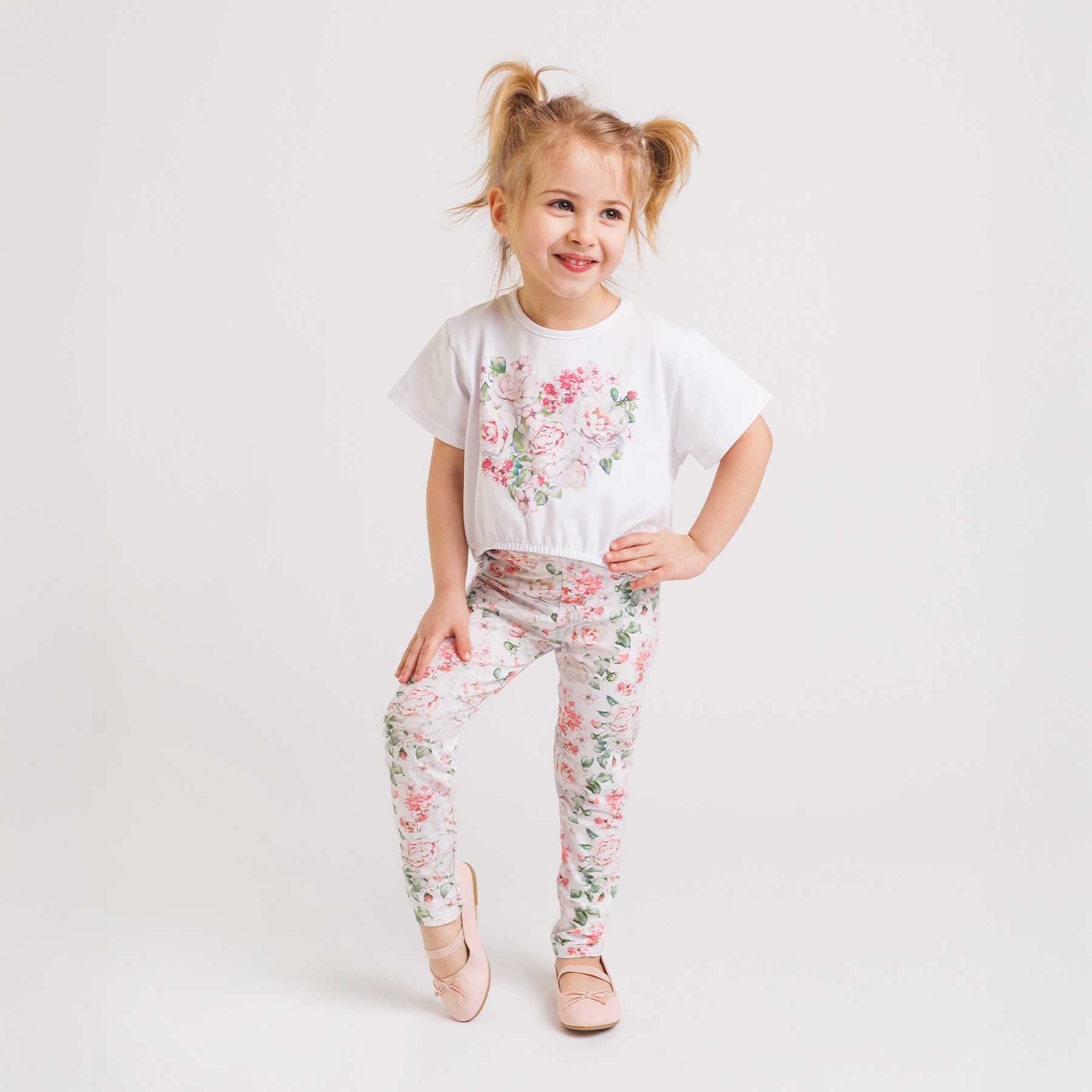 Krótki, bawełniany t-shirt to idealna propozycja dla dziewczynki na ciepłe dni. Wykonany z bawełny, zapewni jej wygodę i swobodę ruchów. Krótki rękaw oraz półokrągły dekolt to gwarancja komfortu. Dodatkowo posiada zakończenie z wszytą gumką co podkreśla oryginalny styl koszulki.