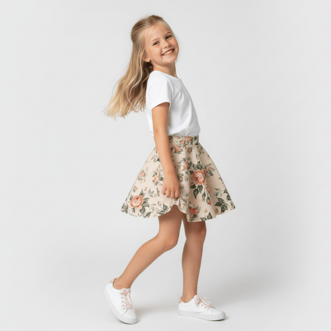 Krój z koła powoduje, że spódnica pięknie się układa. Pasuje zarówno do stylizacji eleganckich, jaki i na co dzień do trampek.