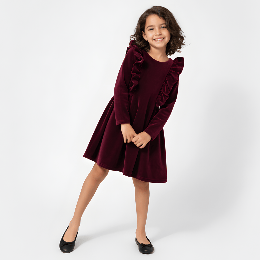 Bordowy welur to jeden z najbardziej świątecznych kolorów — doskonale wpisuje się w zimowy klimat i gwarantuje efekt „wow” na rodzinnych zdjęciach. Ta sukienka to propozycja, która zachwyca nie tylko wyglądem, ale też wygodą i jakością wykonania.