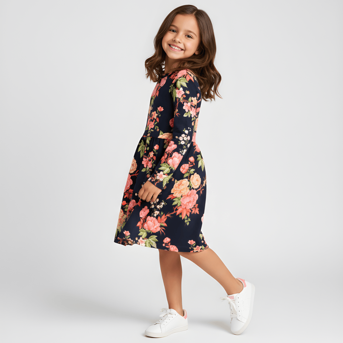 Elegancka, rozkloszowana sukienka z długim rękawem. Uszyta w polskiej szwalni, z najwyższej jakości bawełny, jest miękka, bardzo wygodna i elastyczna. Fason z okrągłym dekoltem, dopasowaną górą i delikatnie rozkloszowanym dołem to propozycja doskonała zarówno, jako stylizacja codzienna, jak i odświętna. Sukienka sprawdzi się w szkole, w przedszkolu, na urodzinowym przyjęciu czy w czasie świąt. Kwiatowy motyw na ciemnogranatowym tle dobrze wkomponuje się w dziewczęcą garderobę. Sukienka z pewnością będzie wykorzystywana niemal przez cały rok.