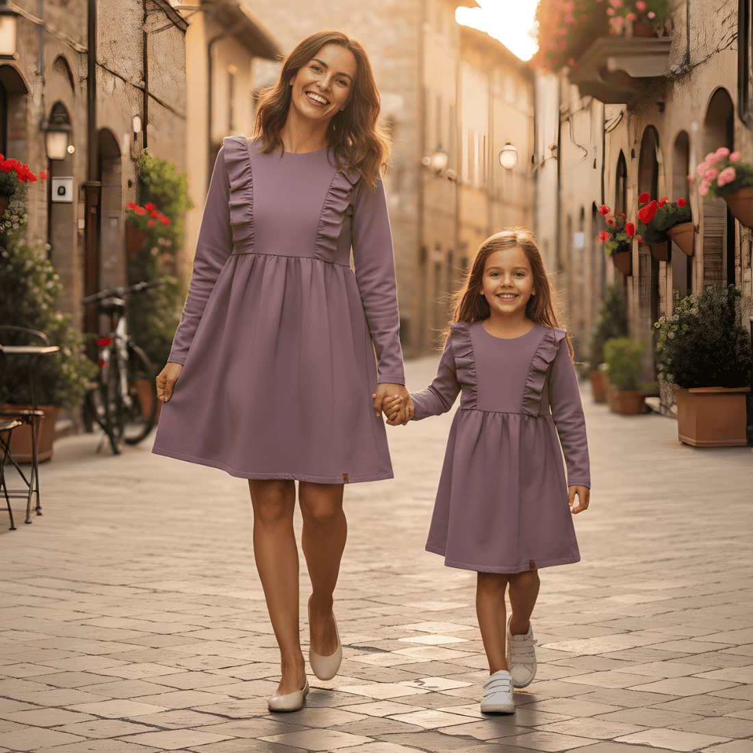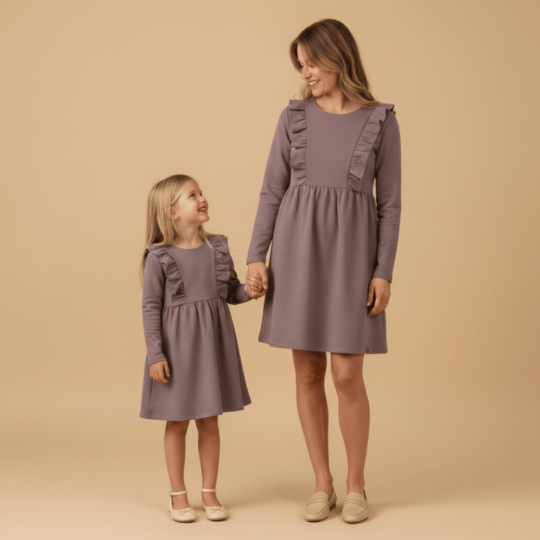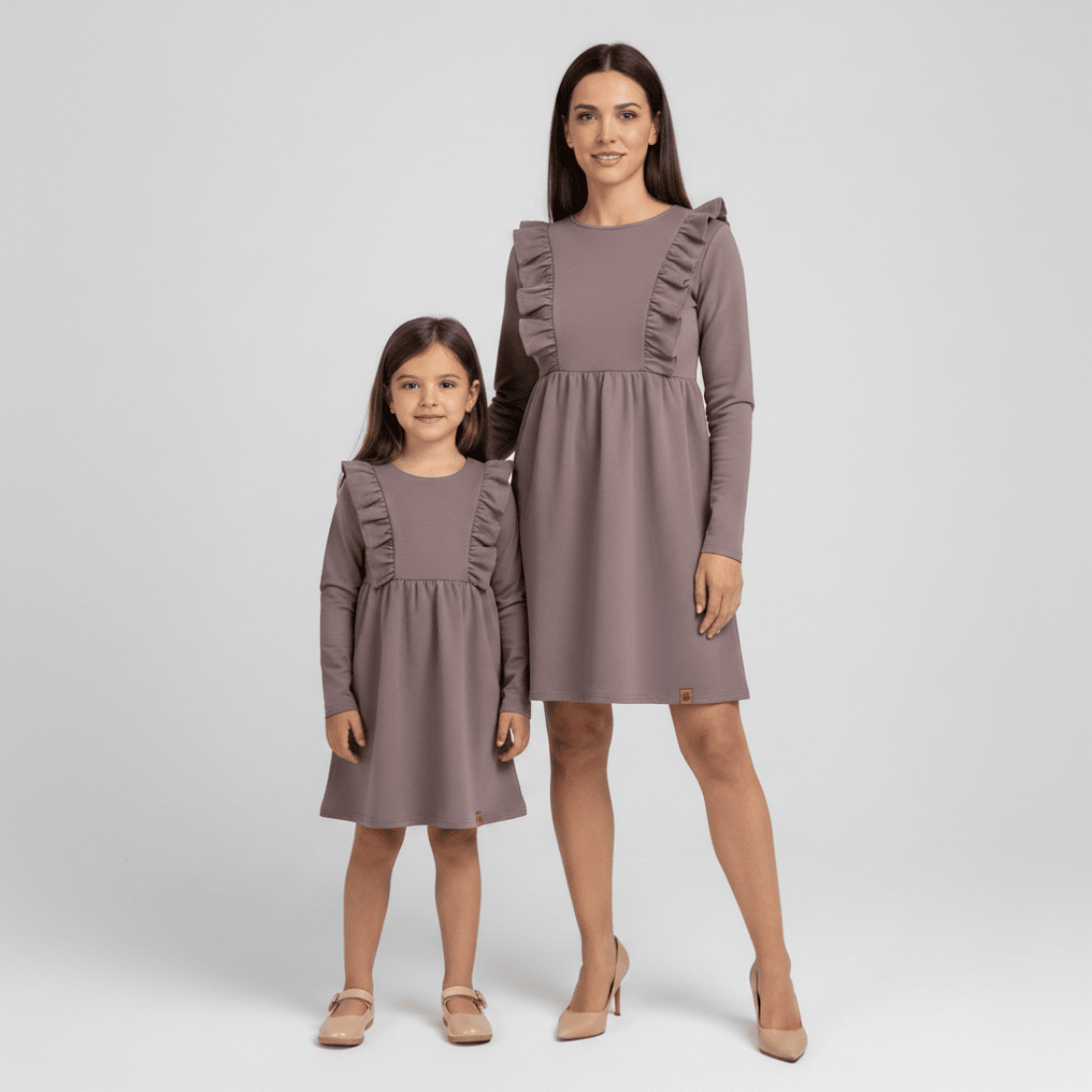 Eleganckie sukienki z długim rękawem, w kolorze brudnego fioletu dla mamy i dla córki. Uszyte zostały w Polsce, z najwyższej jakości dzianiny bawełnianej, która jest miękka, elastyczna i bardzo wygodna. Góra sukienki z okrągłym dekoltem jest delikatnie dopasowana, dół został pięknie rozkloszowany. Sukienka jest ozdobiona efektownymi, pionowymi falbankami biegnącymi wzdłuż ramion oraz guziczkami umieszczonymi na plecach. Wszystkie te elementy składają się na piękną, klasyczną kreację idealną nie tylko co dziennych stylizacji, ale też na oficjalne okazje i rodzinne święta.