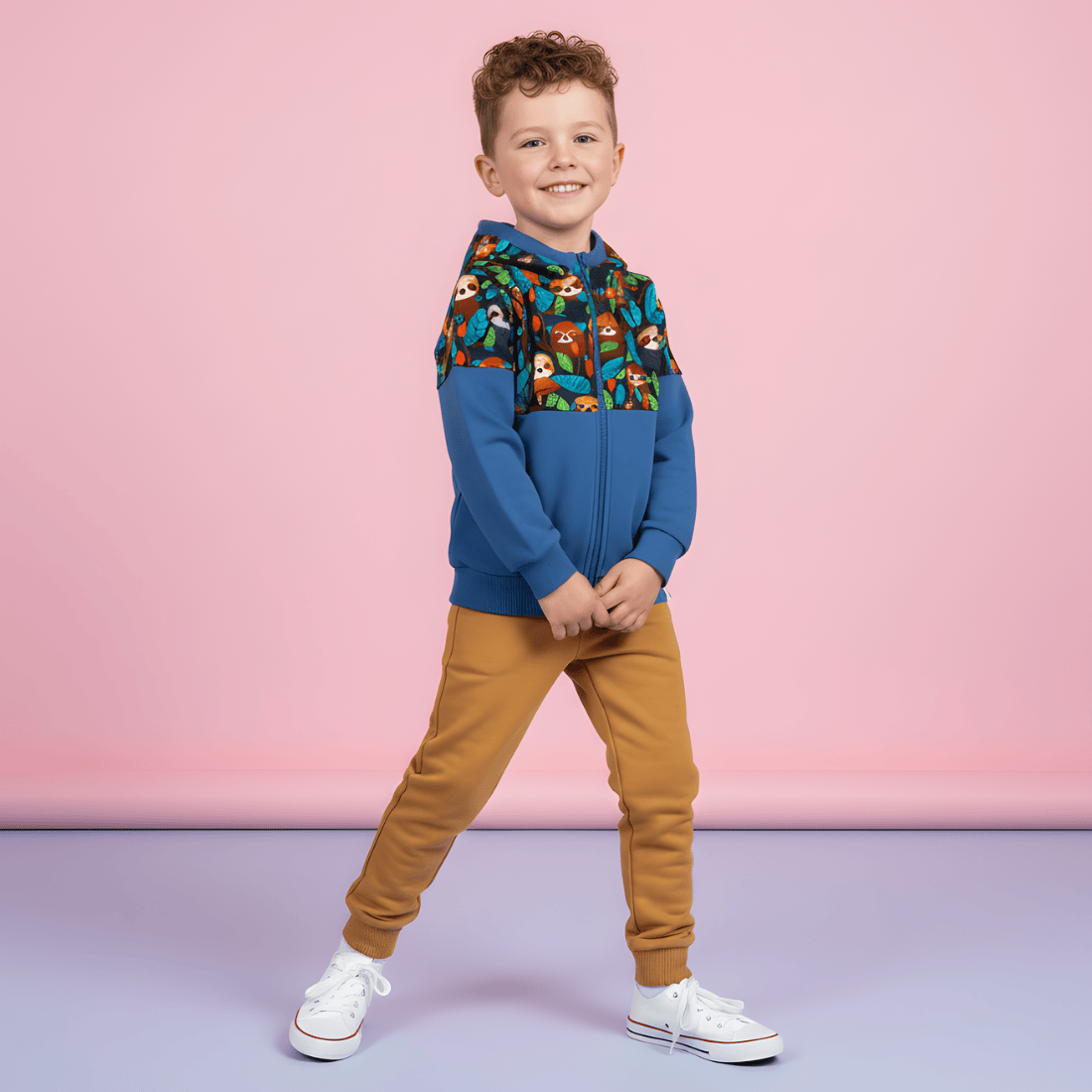 Niebieska bluza dresowa z kapturem. Uszyta w Polsce, z najwyższej jakości bawełny, jest wygodna, miękka i elastyczna, co ma duże znaczenie w dziecięcej garderobie. Bluza ma prosty fason z praktycznymi ściągaczami, obszerny kaptur i dwie kieszenie, do których zmieszczą się wszystkie dziecięce skarby. Niebieska baza została uzupełniona o kolorowy motyw w kolorowe leniwce, które nadają bluzie nieco bardziej dziecięcego charakteru. Dzięki temu barwnemu motywowi, bluzę zdecydowanie łatwiej dopasować do różnych t-shirtów i bluzek, tworząc ciekawe stylizacje na każdy dzień.