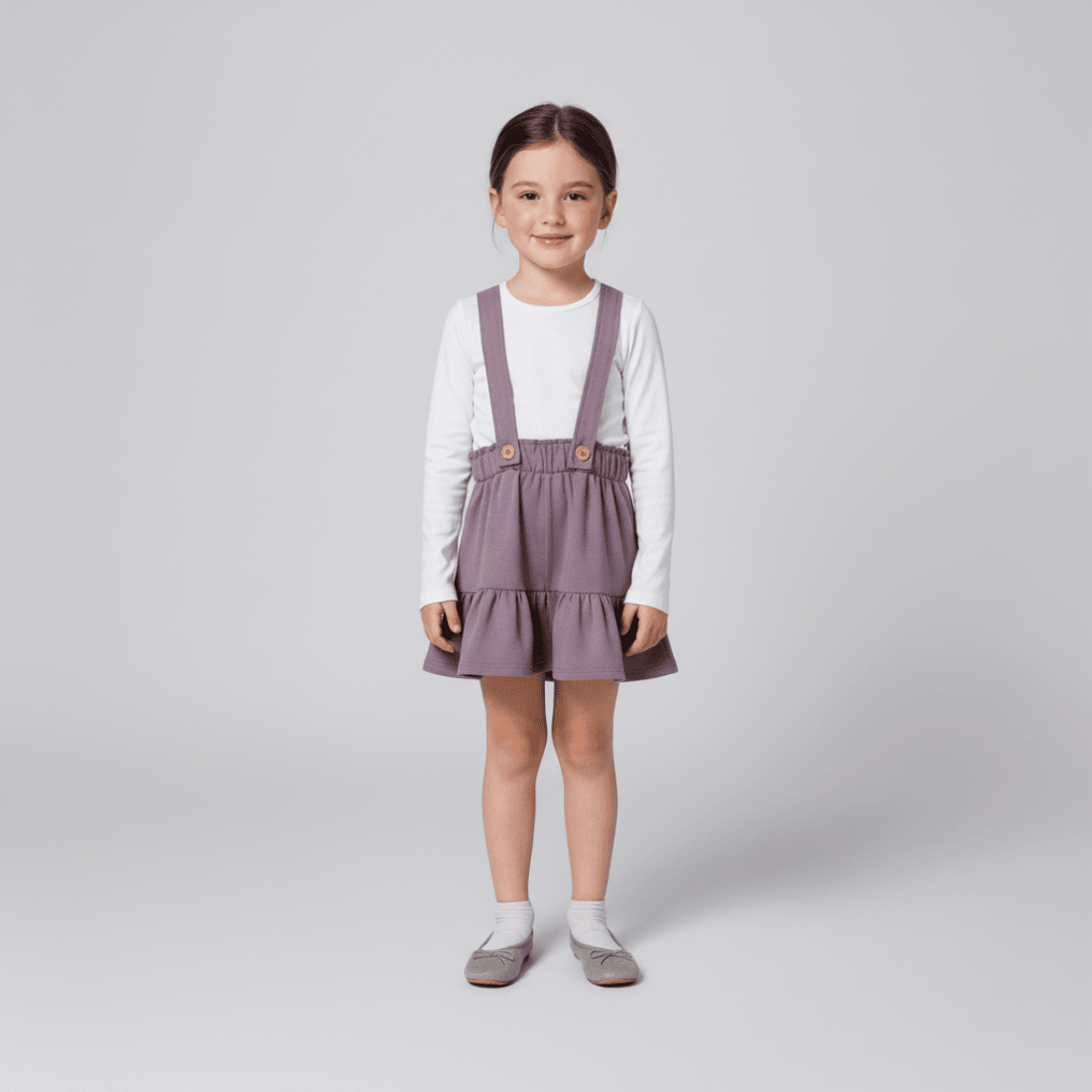 Spódnica nad kolano ma rozkloszowany fason wykończony szeroką falbanką. Elastyczna gumka w pasie doskonale dopasowuje się do dziewczęcej sylwetki, nie uciskając jej i zapewniając pełen komfort noszenia. Do spódnicy dodane zostały dekoracyjne szelki zapinane na małe, drewniane guziczki. Taki dodatek sprawił, że spódnica nabrała bardziej eleganckiego i klasycznego wyrazu. Szelki w razie potrzeby można odpiąć, by spódnica za każdym razem prezentowała się zupełnie inaczej.