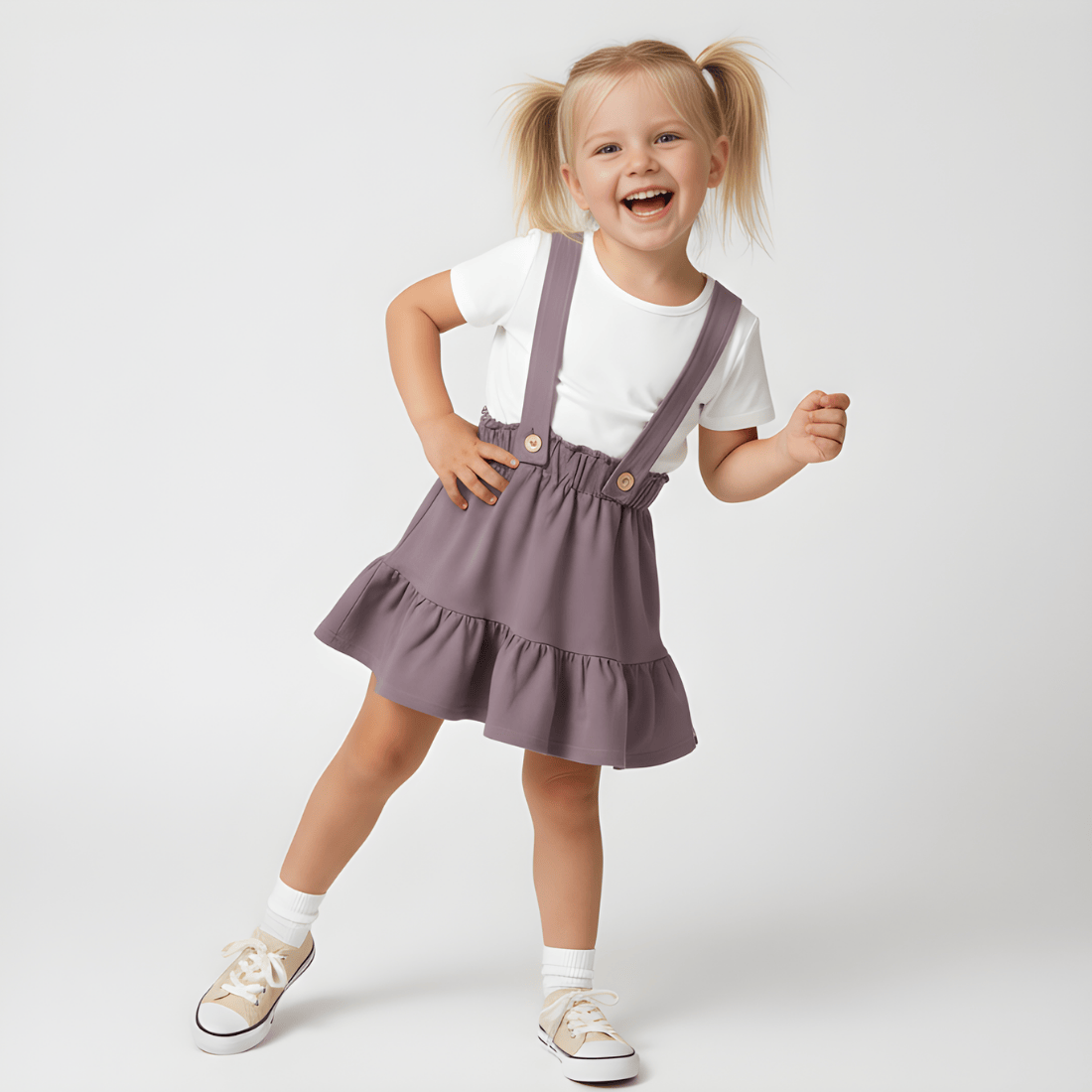 Spódnica nad kolano ma rozkloszowany fason wykończony szeroką falbanką. Elastyczna gumka w pasie doskonale dopasowuje się do dziewczęcej sylwetki, nie uciskając jej i zapewniając pełen komfort noszenia. Do spódnicy dodane zostały dekoracyjne szelki zapinane na małe, drewniane guziczki. Taki dodatek sprawił, że spódnica nabrała bardziej eleganckiego i klasycznego wyrazu. Szelki w razie potrzeby można odpiąć, by spódnica za każdym razem prezentowała się zupełnie inaczej.