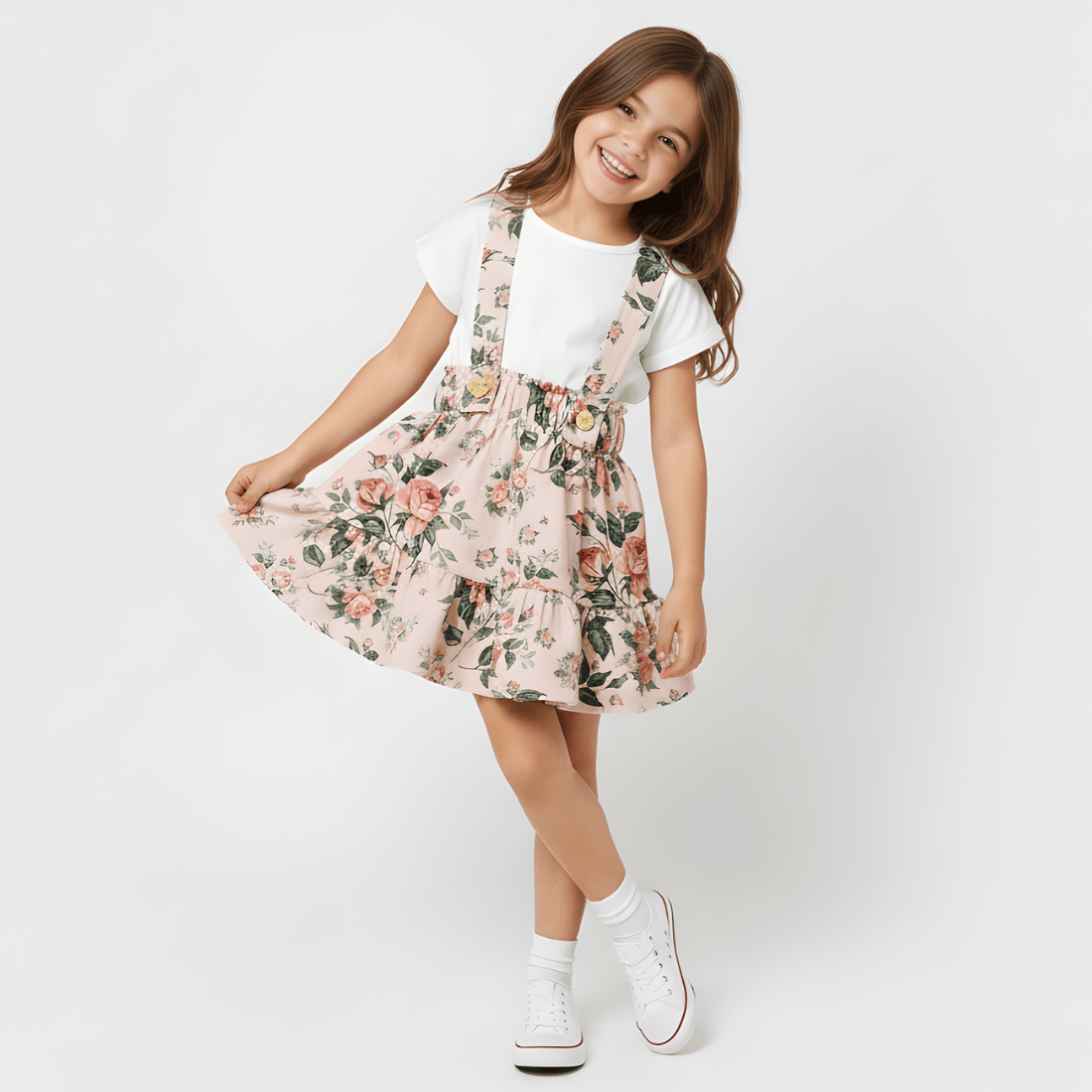 Spódnica ma elastyczną, szeroką gumkę w pasie. Jest rozkloszowana, a dół ma ozdobiony szeroką falbanką. Całość prezentuje się niezwykle efektownie i doskonale układa się podczas noszenia, nie krępując przy tym ruchów. Efektu wow dopełniają dekoracyjne szelki zapinane na drewniane guziki. Z nimi spódnica wygląda jeszcze bardziej efektownie i oryginalnie. Szelki można całkowicie odpiąć, co daje możliwość tworzenia różnorodnych stylizacji dostosowanych do rożnych okazji.