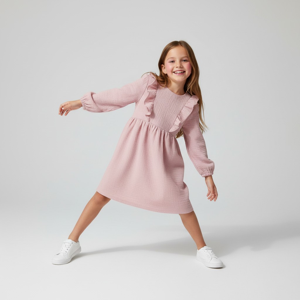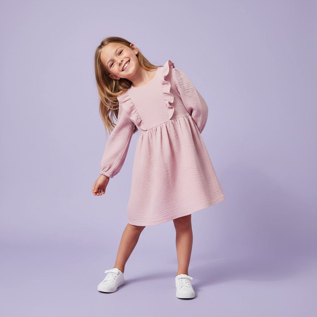 Elegancka, muślinowa sukienka dziewczęca w klasycznym wydaniu. Uszyta w Polsce, z niezwykłą starannością i dbałością o detale, zachwyca swoimi pięknymi wykończeniami. Sukienka ma dopasowaną górę z okrągłym dekoltem i zapięciem na guziczki, umieszczone na plecach. Dół jest delikatnie rozkloszowany, dzięki czemu wspaniale układa się podczas noszenia. Długie rękawy zakończone delikatnym ściągaczem dobrze dopasowują się do długości rąk, a pionowe falbanki prezentują się niczym klasyczne szelki znane z dawnych, dziewczęcych sukienek. Muślin to materiał niezwykle wygodny, przewiewny, ale też praktyczny. Nie odkształca się i często nie wymaga prasowania przed założeniem, co jest jego dużym atutem.