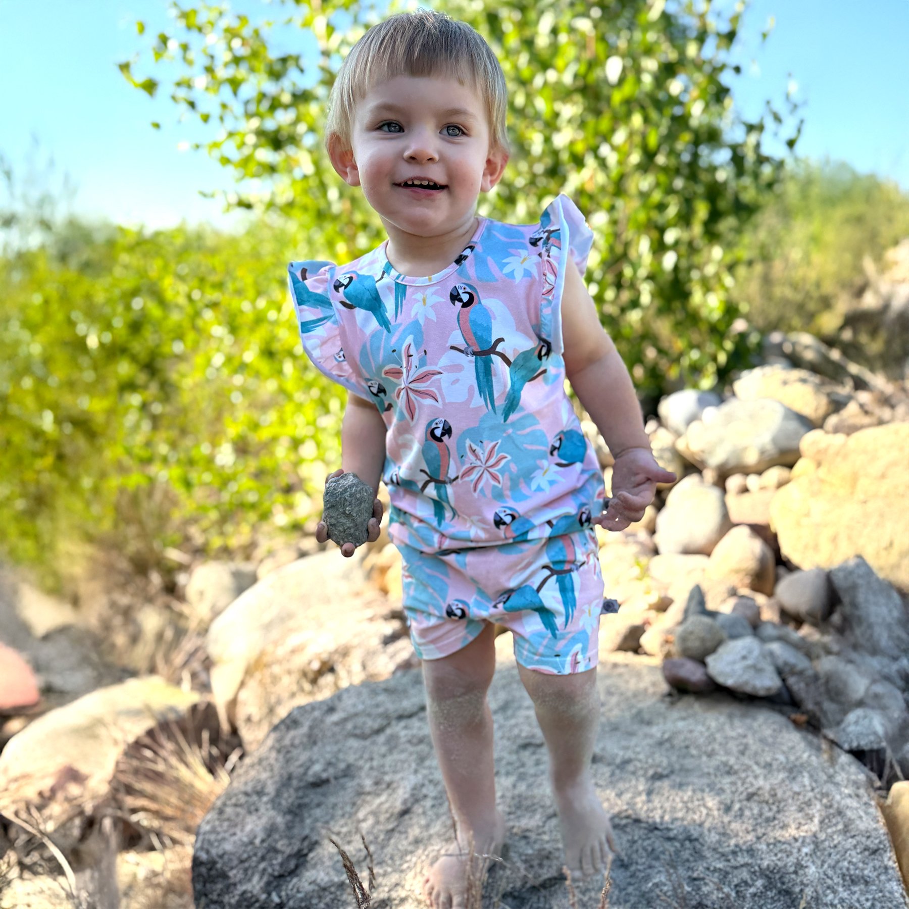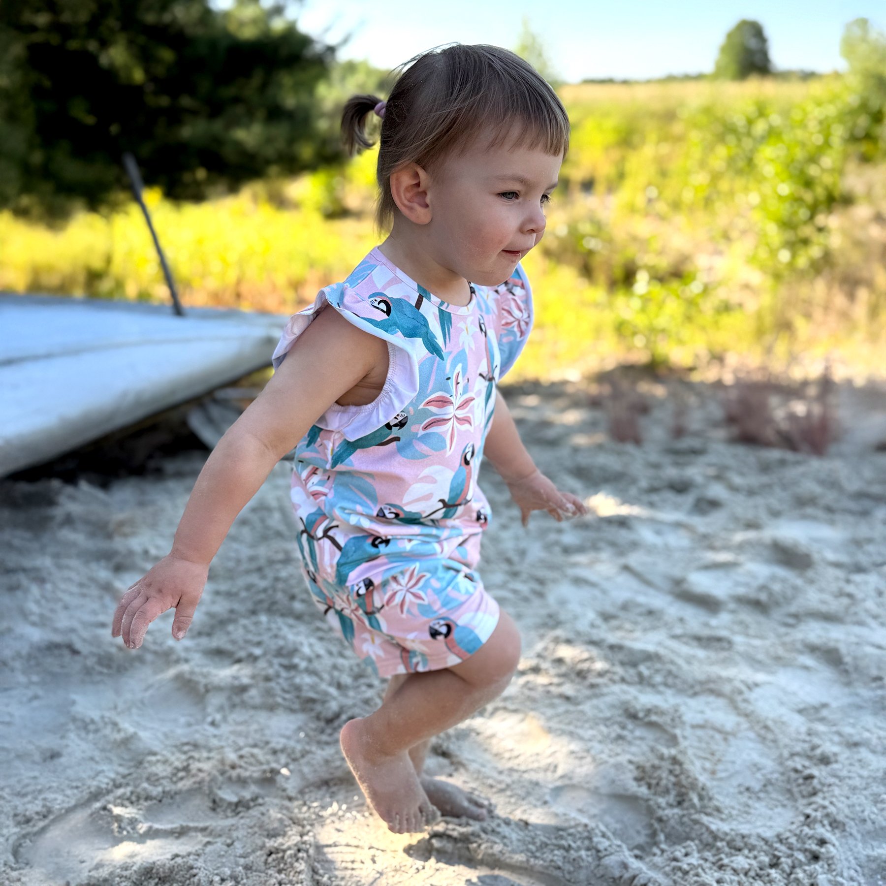 Dodaj do swojej garderoby odrobinę egzotyki i lekkości dzięki bluzce bawełnianej bez rękawa z falbanką Wings w uroczym, różowym kolorze z kolorowym motywem papug. Wykonana z wysokiej jakości, miękkiej bawełny, zapewnia komfort noszenia nawet w najcieplejsze dni. Lekko rozkloszowany krój i dekoracyjna falbanka przy ramionach dodają dziewczęcego uroku i swobody ruchów, a oryginalny, tropikalny wzór przyciąga spojrzenia i sprawia, że każda stylizacja nabiera wakacyjnego charakteru. To idealny wybór dla miłośniczek wyrazistych, a jednocześnie wygodnych ubrań, które łączą modę z funkcjonalnością.