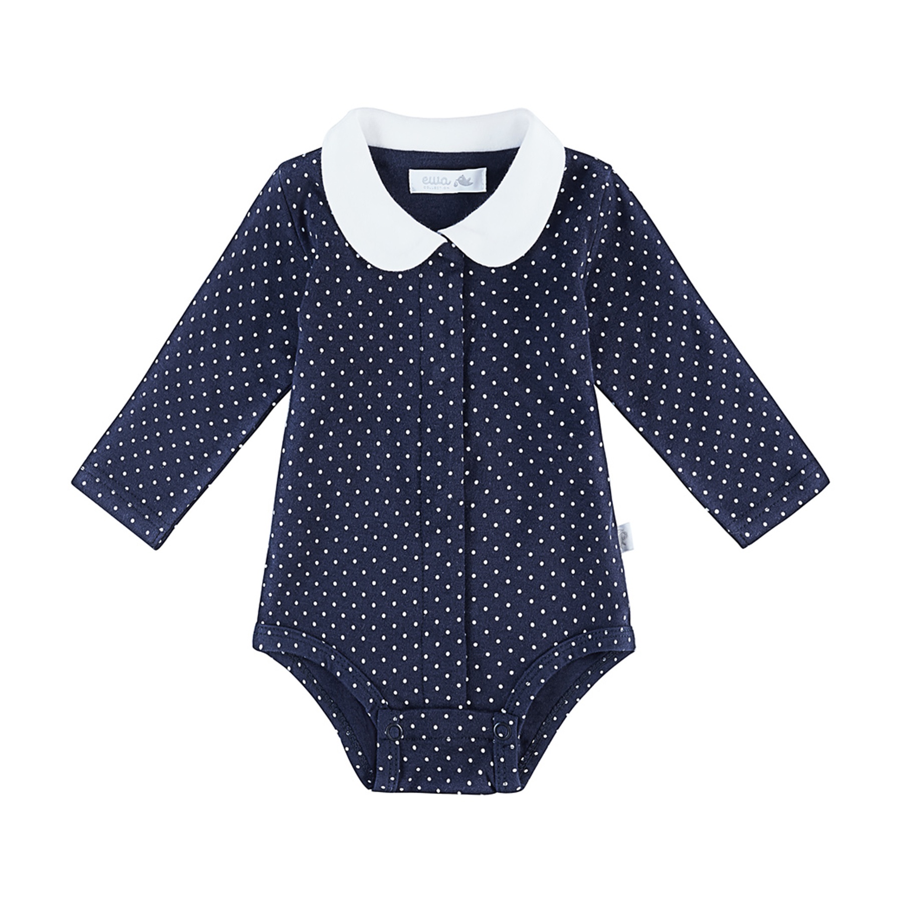 Stylowe i wygodne body niemowlęce, które łączy klasykę z urokiem dziecięcej delikatności. Wykonane z miękkiej, wysokogatunkowej bawełny, idealnie sprawdzi się zarówno na co dzień, jak i na wyjątkowe okazje. Granatowy materiał w urocze białe kropeczki nadaje całości subtelnego charakteru, a elegancki biały kołnierzyk dodaje szyku i sprawia, że maluszek wygląda wyjątkowo. Body jest nie tylko piękne, ale także funkcjonalne – delikatna tkanina jest przyjazna dla skóry dziecka, a praktyczne zapięcia ułatwiają przebieranie. To doskonały wybór dla rodziców ceniących jakość, wygodę i styl.