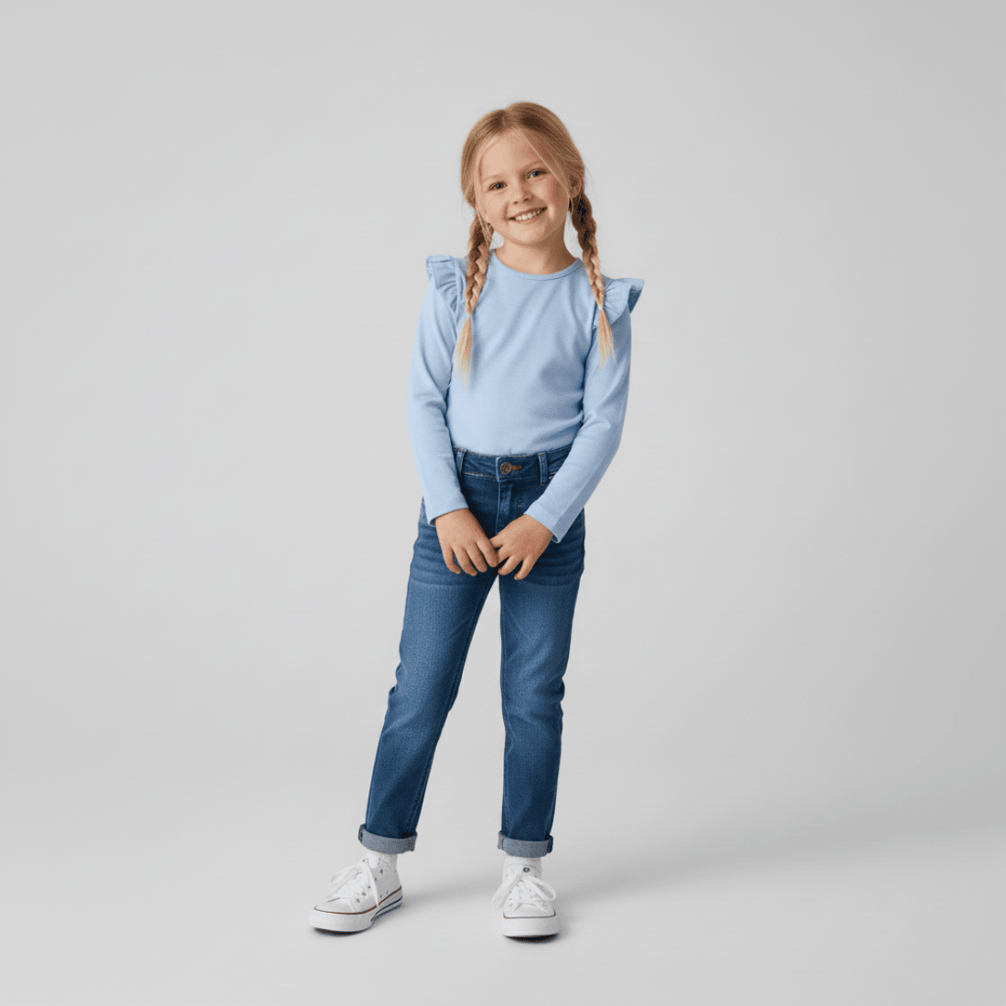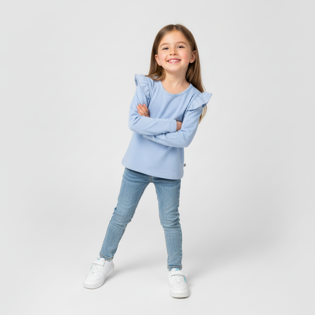Bluzka ma prosty fason z długim rękawem i dekoracyjnymi falbankami na ramionach. Jest to model, który doskonale dopasowuje się do dziewczęcej sylwetki, nie krępując jej ruchów i zapewniając pełną swobodę noszenia.