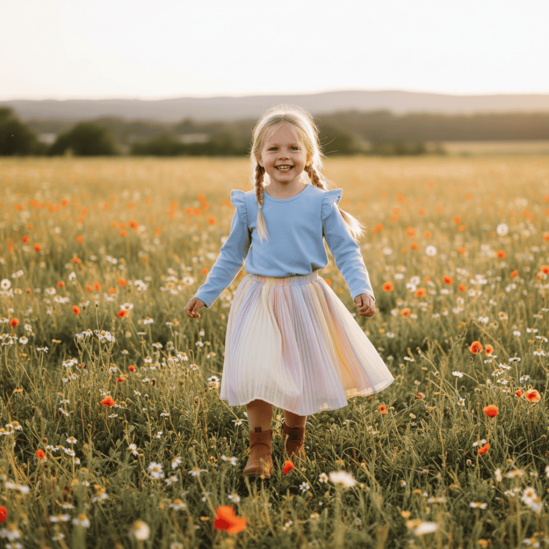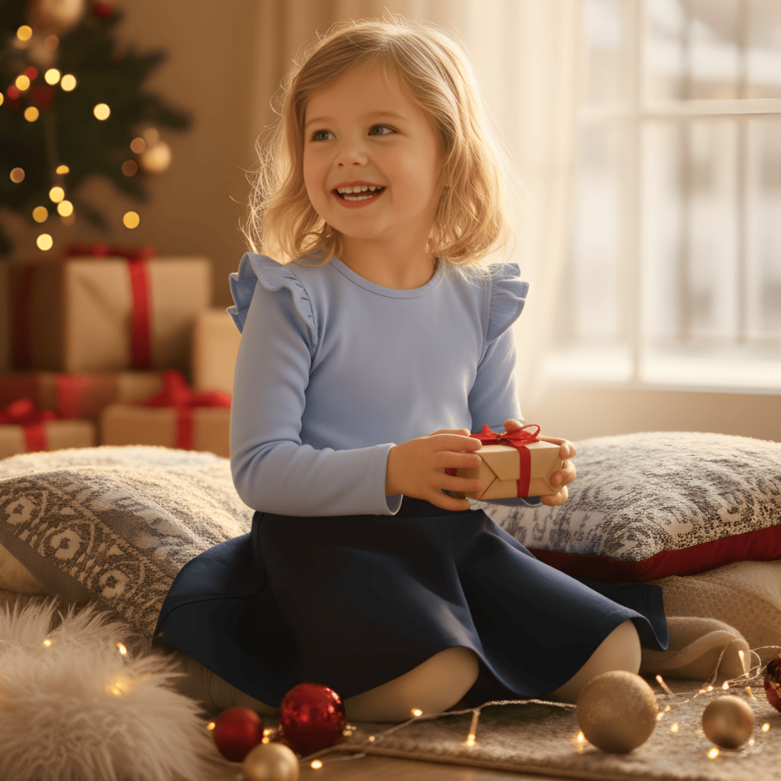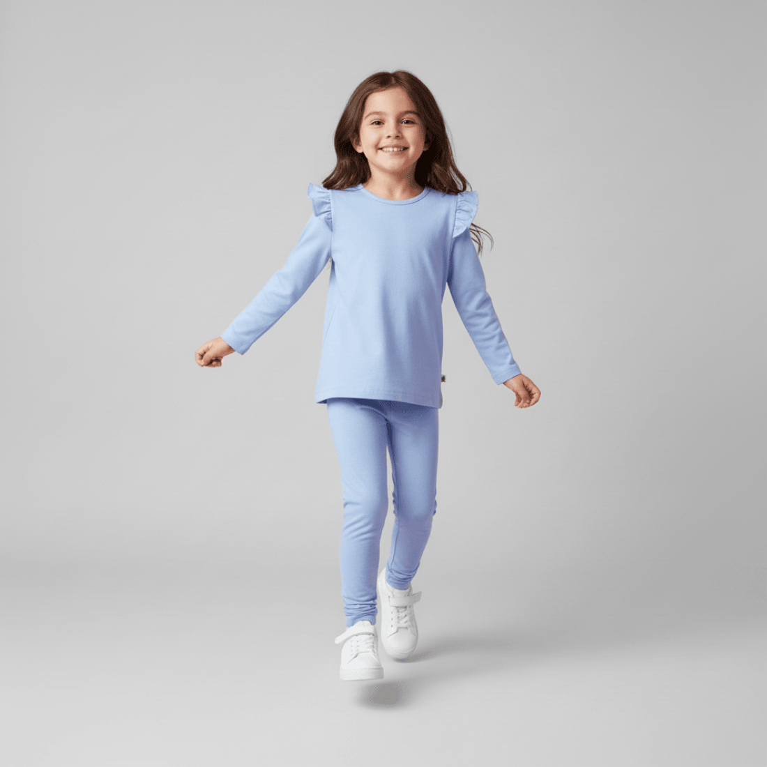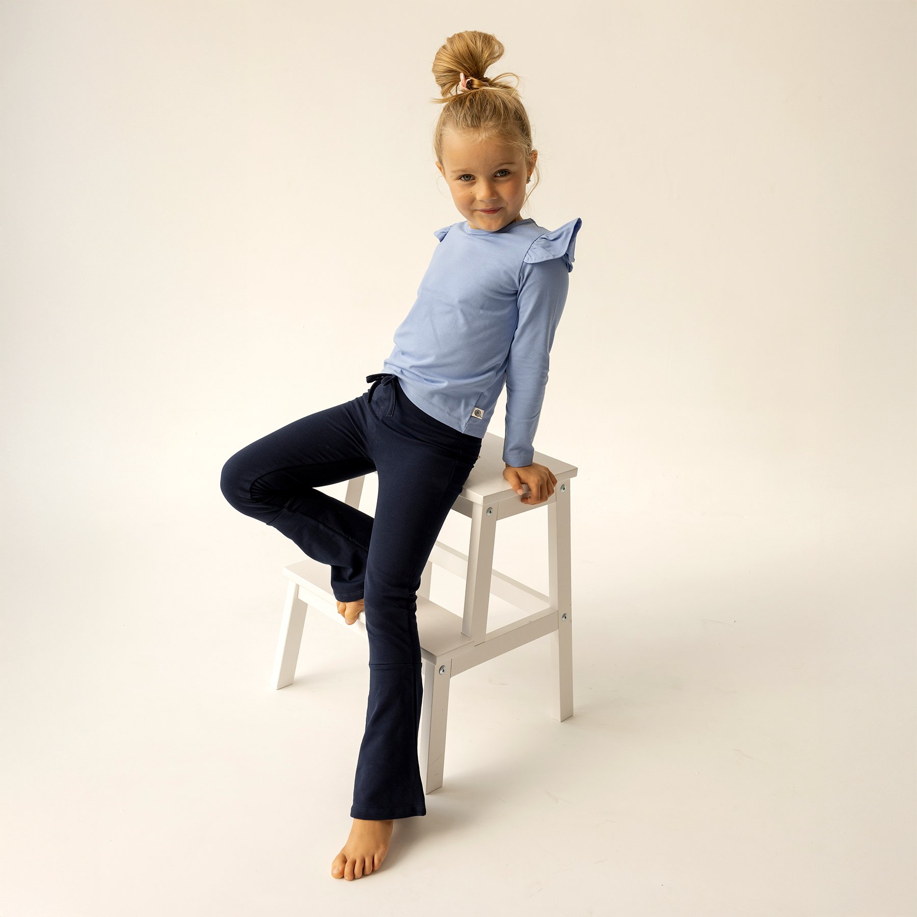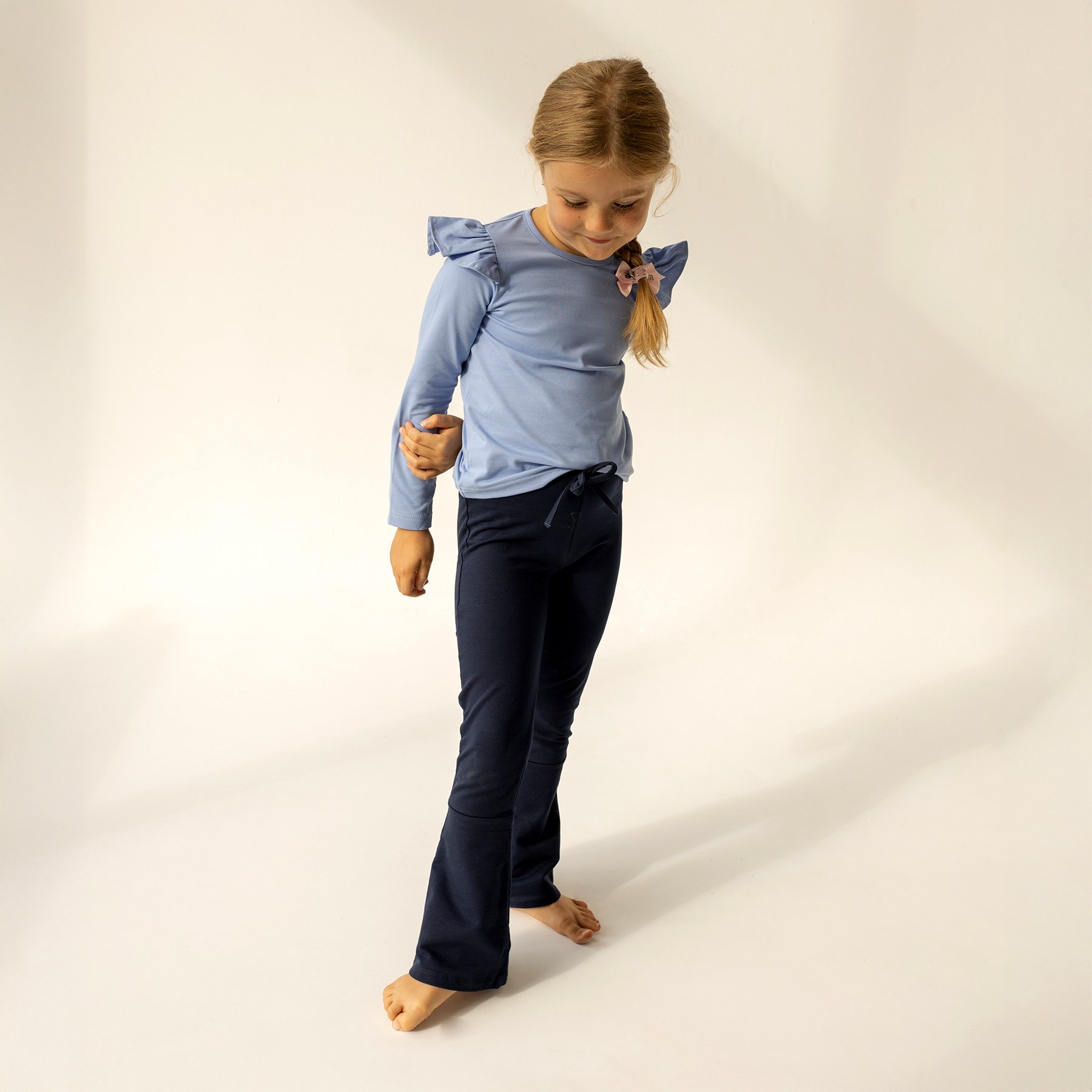 Niebieska bluzka dziewczęca, uszyta w Polsce, z wysokiej jakości bawełny, jest przyjemna w dotyku, elastyczna i przewiewna, dzięki czemu sprawdzi się idealnie także w cieplejszych dniach.