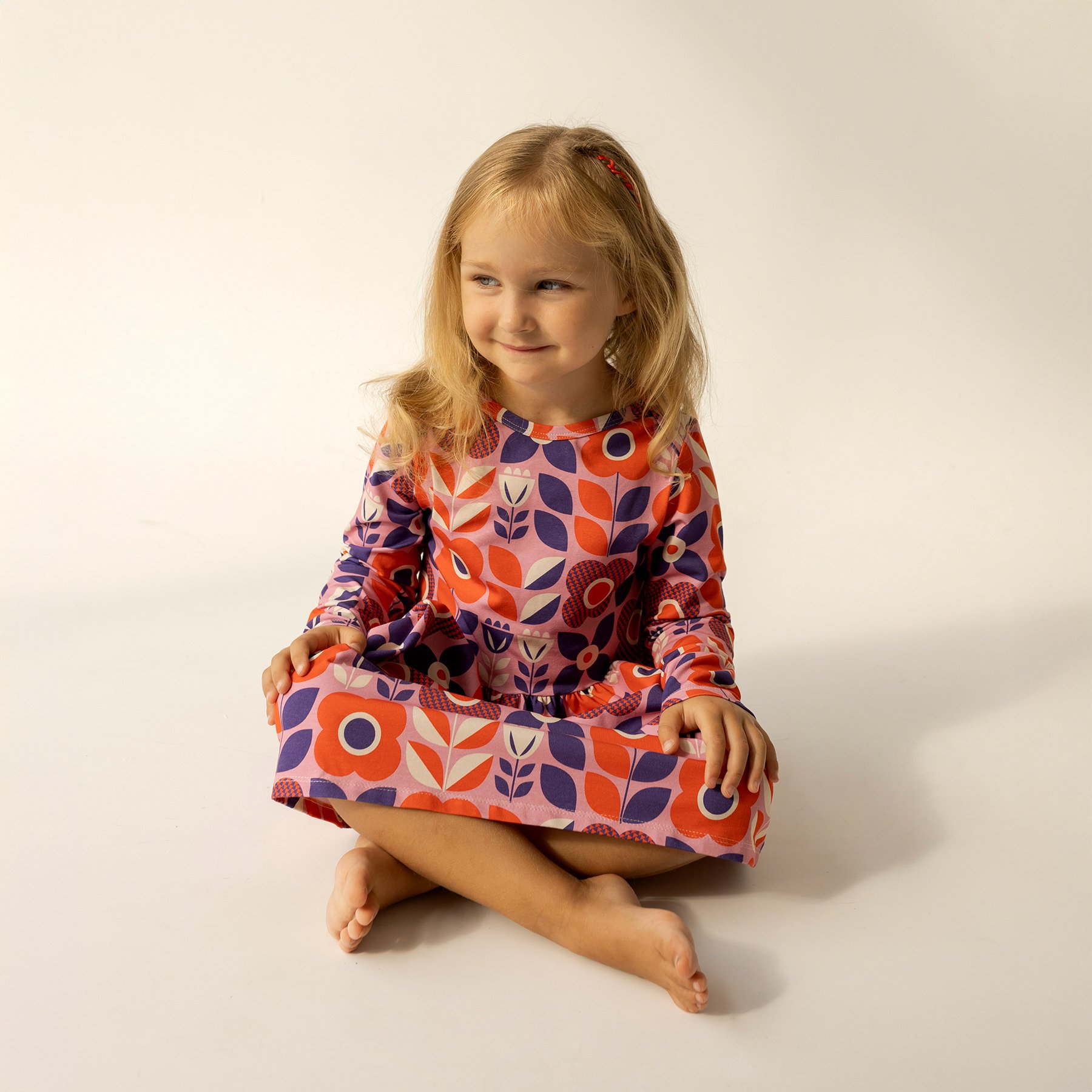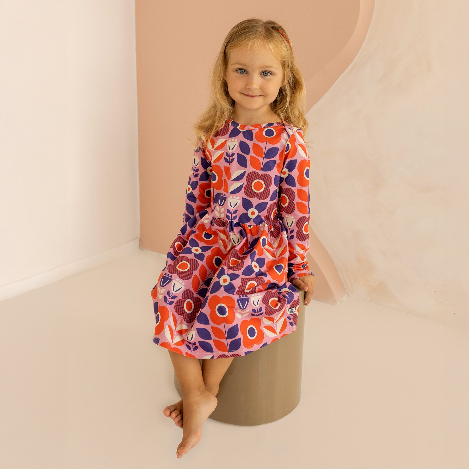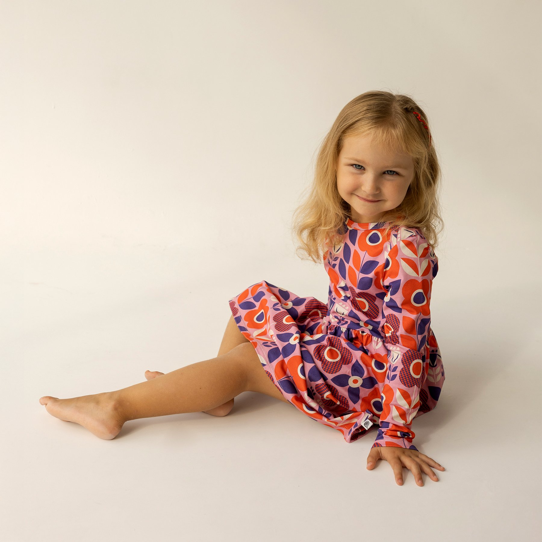 Dziewczęca sukienka z długim rękawem. Uszyta w Polsce, z wysokiej jakości bawełny. Jest miękka, elastyczna, przewiewna i niezwykle wygodna, dzięki czemu dziewczęta chętnie będą wybierały ją nie tylko do stylizacji świątecznych, ale też na co dzień.