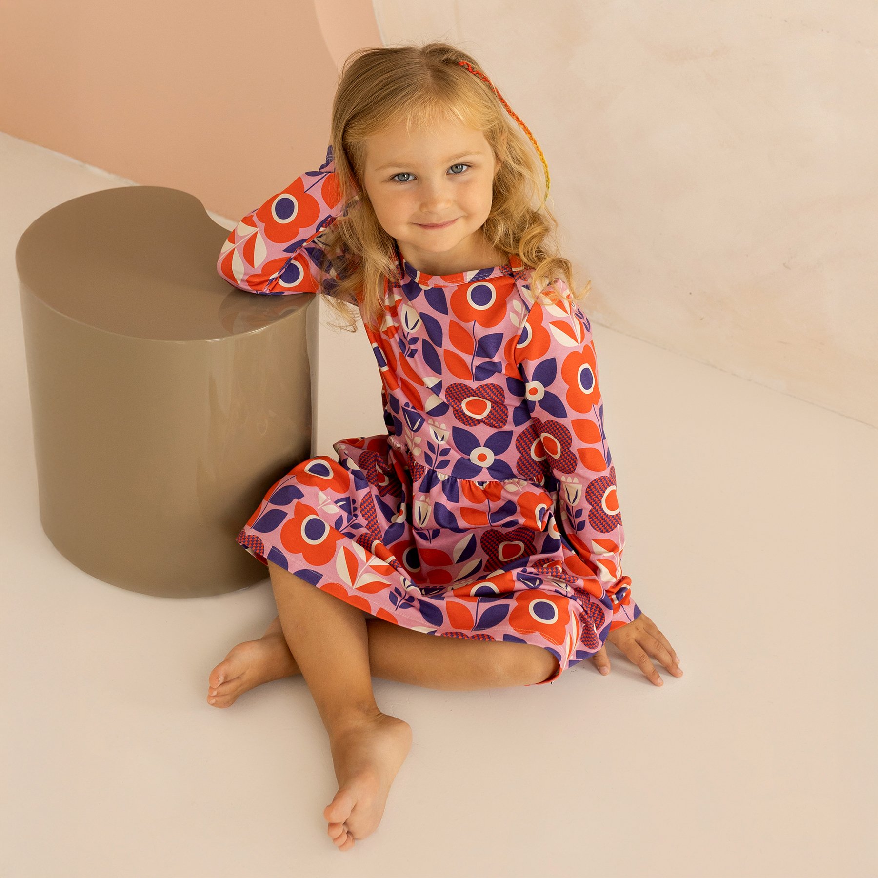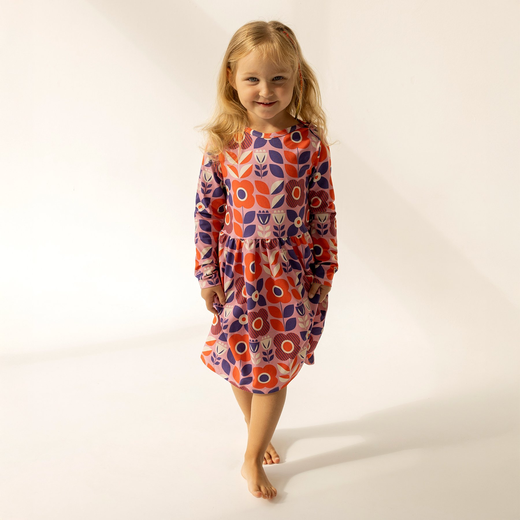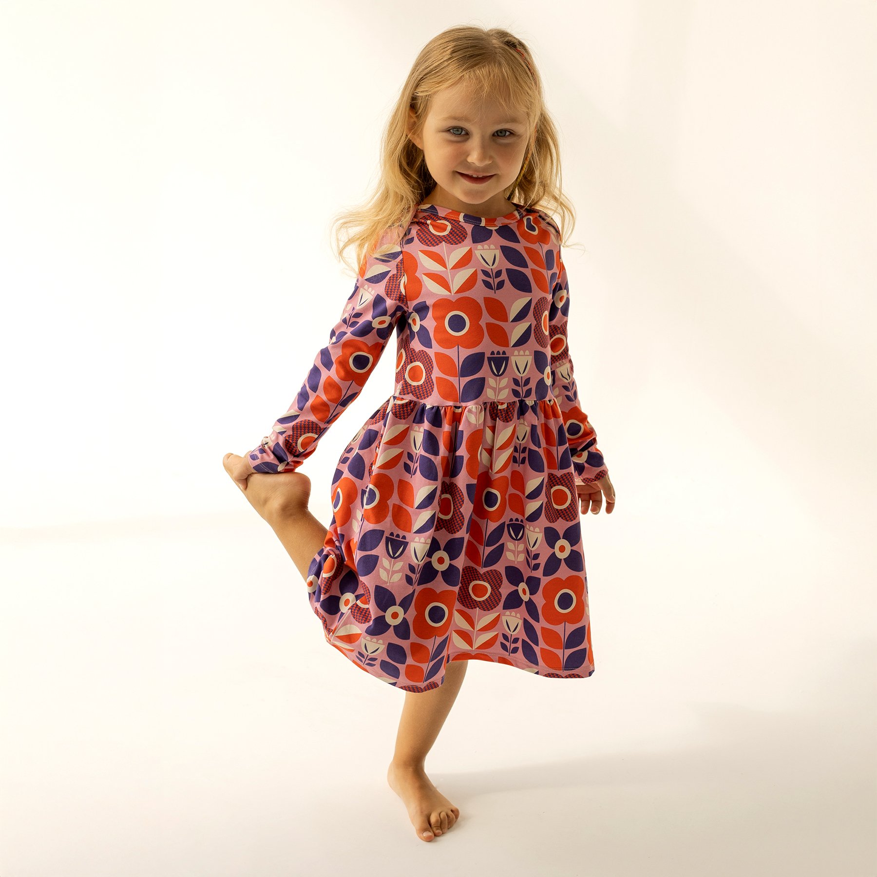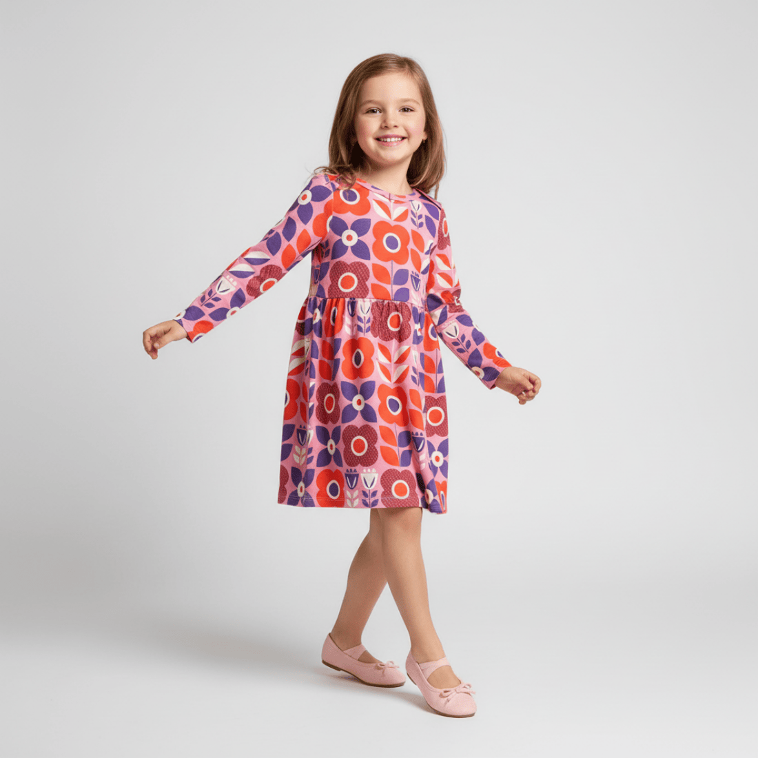 Dziewczęca sukienka z długim rękawem. Uszyta w Polsce, z wysokiej jakości bawełny. Jest miękka, elastyczna, przewiewna i niezwykle wygodna, dzięki czemu dziewczęta chętnie będą wybierały ją nie tylko do stylizacji świątecznych, ale też na co dzień.
